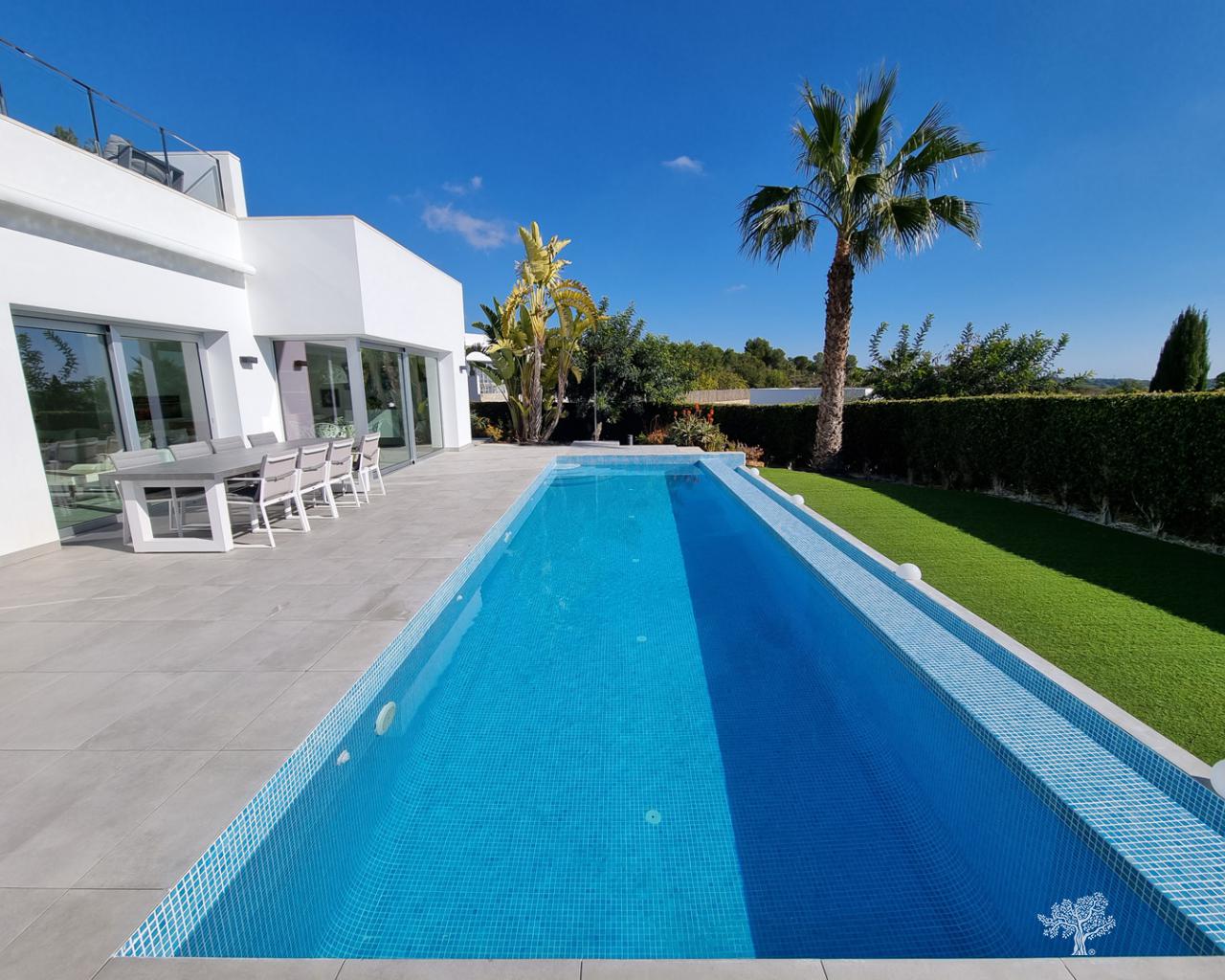 Moderne Villa in der Gemeinschaft Tipuana Las Colinas Golf & Country Club mit Infinity-Pool und Landschaftsgarten. Mit 2 Schlafzimmern 1 Badezimmer, geräumige Terrassen einschließlich Dachterrasse mit Panoramablick auf das Meer. Südausrichtung bietet Sonne den ganzen Tag und ruhige Lage in dieser privaten Gemeinschaft, die aus nur 12 Villen insgesamt besteht. Offene Küche, einschließlich aller Elektrogeräte, Klimaanlage mit Luftzone und Domotik-System zur Steuerung der elektrischen Rollläden und Lichter. Fußbodenheizung in der gesamten Villa, LED-Strahler, manuelle Poolabdeckung und Heizungspumpe für den Pool.