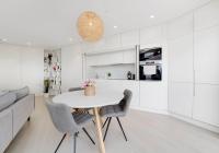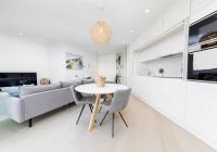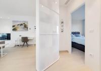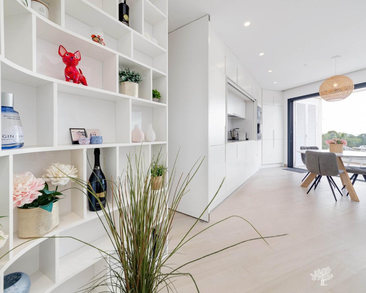 Das Innere wurde mit einem luxuriösen Finish mit Top-Qualität Ausrüstung entworfen. Das Layout besteht aus einem hellen und geräumigen offenen Wohn- und Essbereich mit großen Fenstern, die sich zur Terrasse hin öffnen. Im Hauptwohnbereich befindet sich eine voll ausgestattete Küche im amerikanischen Stil, die in Weiß gehalten ist und über ein elegantes Design verfügt, bei dem der Bereich für die Essenszubereitung vollständig geschlossen werden kann, wenn er nicht in Gebrauch ist. Das große Hauptschlafzimmer verfügt über ein eigenes Bad mit Regendusche und Einbauschränken. Es gibt auch ein weiteres großes Schlafzimmer mit Einbauschränken, beide Schlafzimmer blicken auf die grüne Landschaft auf der Rückseite des Hauses, und es gibt ein separates Gästebad mit Regendusche. Die Immobilie wurde geschmackvoll in neutralen Tönen gestaltet und dekoriert, einschließlich heller holzfarbener Fliesen in der gesamten Wohnung, die sich bis zur Terrasse erstrecken, die den Innen- und Außenbereich zu einer Einheit verbindet. Die Immobilie wird voll möbliert verkauft und beinhaltet eine Klimaanlage, Fußbodenheizung in beiden Bädern, ein Hausautomatisierungssystem mit Domotica, elektrische Innenjalousien und eine private Tiefgarage mit Abstellraum.