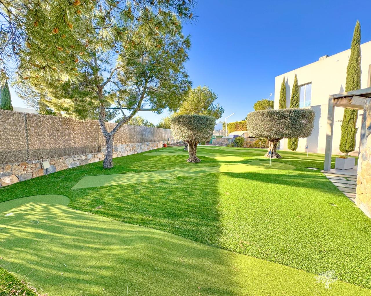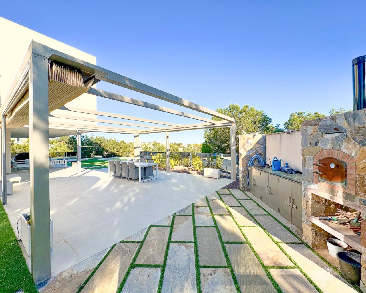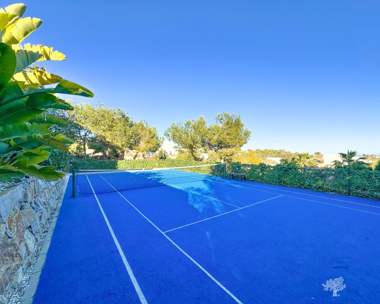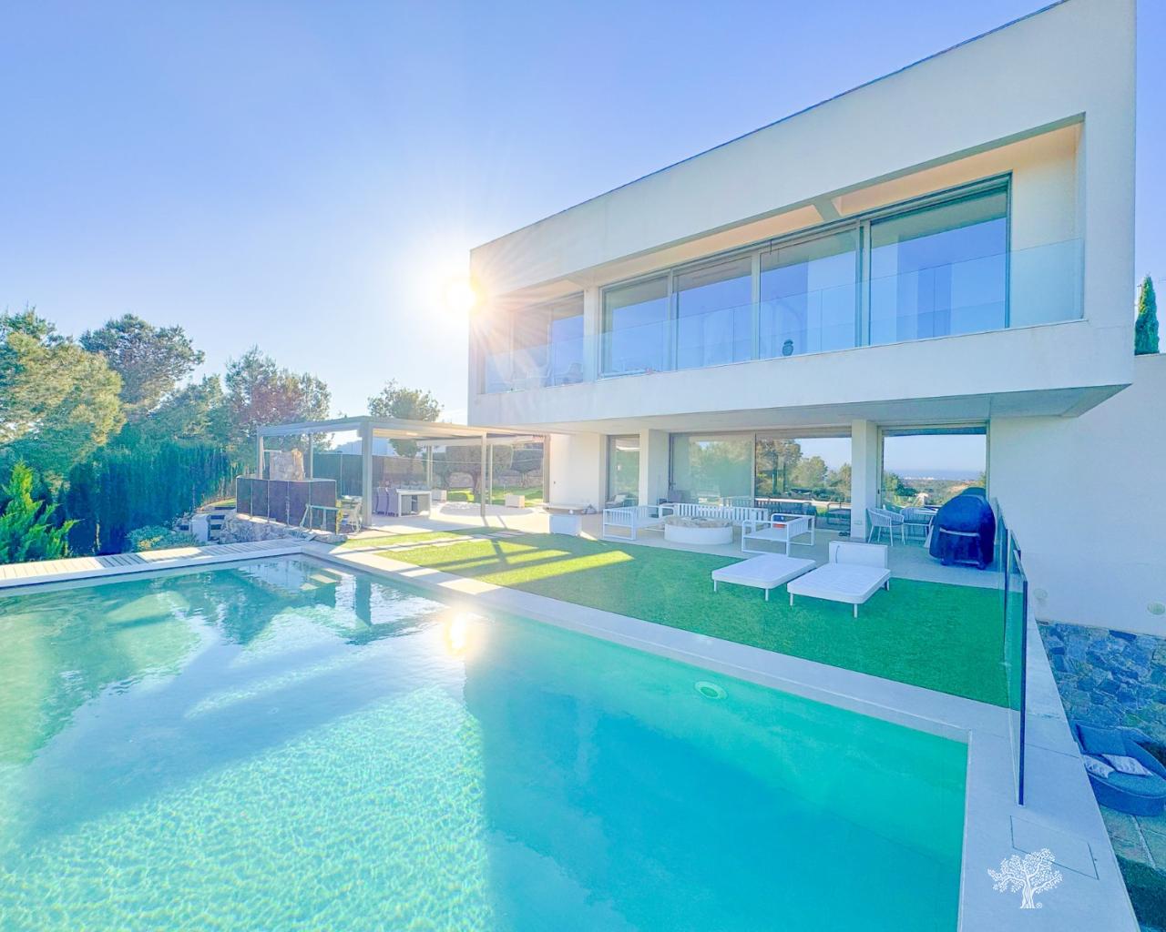 Wunderschöne, freistehende Villa im modernen Stil in der Gemeinde Olivo mit privatem Pool, großem Garten und privatem Tennisplatz. Diese Villa besteht aus 5 Schlafzimmern, 4 Badezimmern + Gäste-WC, privatem Pool mit automatischer Abdeckung und Wärmepumpe, Garage und großzügigen Terrassen mit freiem Blick auf das Meer. Das Grundstück bietet über 1765 m2 mit einer bebauten Fläche von 436 m2 und 176 m2 Terrassen. Sehr private und ruhige Lage innerhalb der Olivo-Gemeinschaft. Die Villa ist auf zwei Ebenen gebaut + Keller und Garage mit Meerblick vom 1. Stock und der Hauptterrasse. Diese Villa wird teilweise möbliert verkauft und verfügt über viele Extras wie ein Smart-Home-System, elektrische Jalousien, eine Klimaanlage mit Klimazone, Fußbodenheizung auf beiden Ebenen (1. und Erdgeschoss) des Hauses sowie eine elektrische Abdeckung und Wärmepumpe für den privaten Pool. Landschaftsgarten auf verschiedenen Ebenen mit privatem Tennisplatz, Petanque-Platz, privatem Sitzbereich mit Pergola und Pizzaofen. Weinkeller und Fitnessraum im Untergeschoss sowie das fünfte Zimmer des Hauses mit eigenem Bad und privater Terrasse.