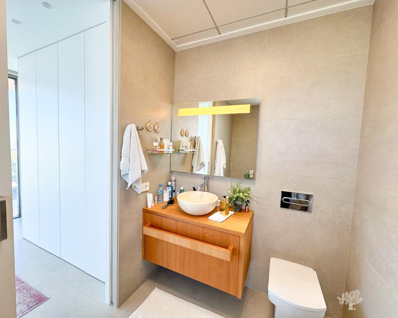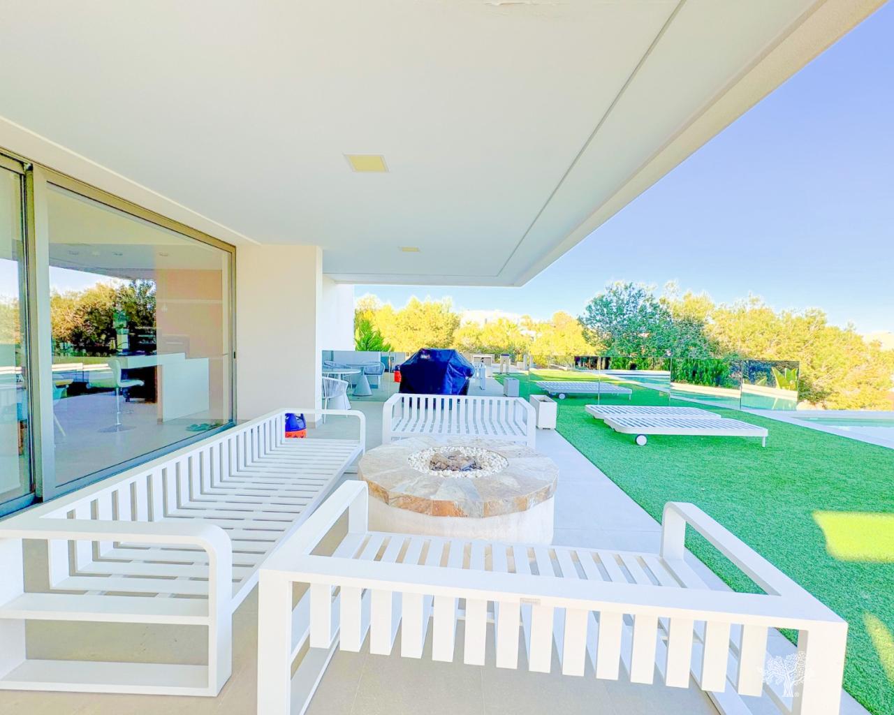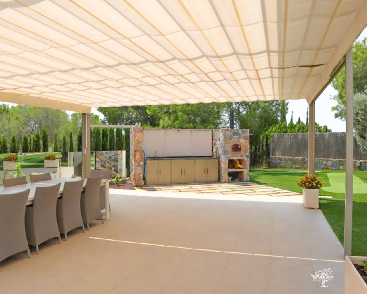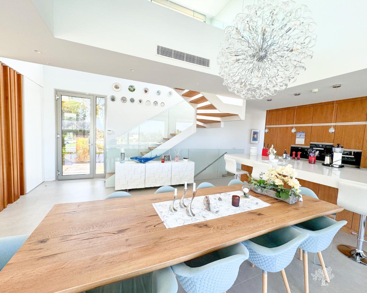 Wunderschöne, freistehende Villa im modernen Stil in der Gemeinde Olivo mit privatem Pool, großem Garten und privatem Tennisplatz. Diese Villa besteht aus 5 Schlafzimmern, 4 Badezimmern + Gäste-WC, privatem Pool mit automatischer Abdeckung und Wärmepumpe, Garage und großzügigen Terrassen mit freiem Blick auf das Meer. Das Grundstück bietet über 1765 m2 mit einer bebauten Fläche von 436 m2 und 176 m2 Terrassen. Sehr private und ruhige Lage innerhalb der Olivo-Gemeinschaft. Die Villa ist auf zwei Ebenen gebaut + Keller und Garage mit Meerblick vom 1. Stock und der Hauptterrasse. Diese Villa wird teilweise möbliert verkauft und verfügt über viele Extras wie ein Smart-Home-System, elektrische Jalousien, eine Klimaanlage mit Klimazone, Fußbodenheizung auf beiden Ebenen (1. und Erdgeschoss) des Hauses sowie eine elektrische Abdeckung und Wärmepumpe für den privaten Pool. Landschaftsgarten auf verschiedenen Ebenen mit privatem Tennisplatz, Petanque-Platz, privatem Sitzbereich mit Pergola und Pizzaofen. Weinkeller und Fitnessraum im Untergeschoss sowie das fünfte Zimmer des Hauses mit eigenem Bad und privater Terrasse.