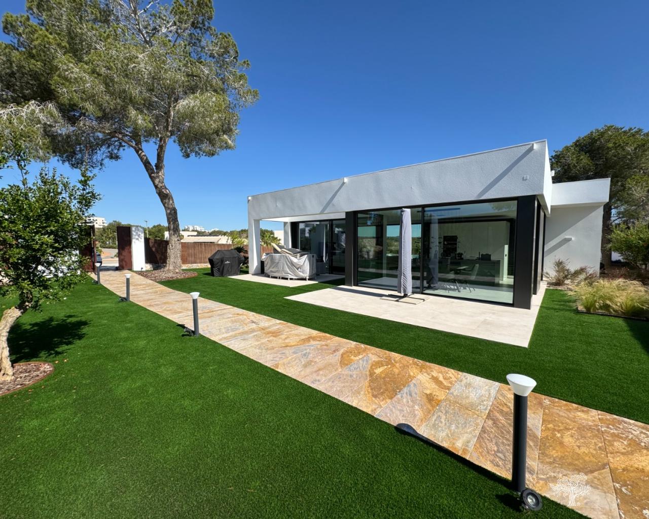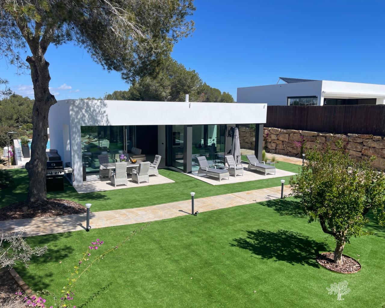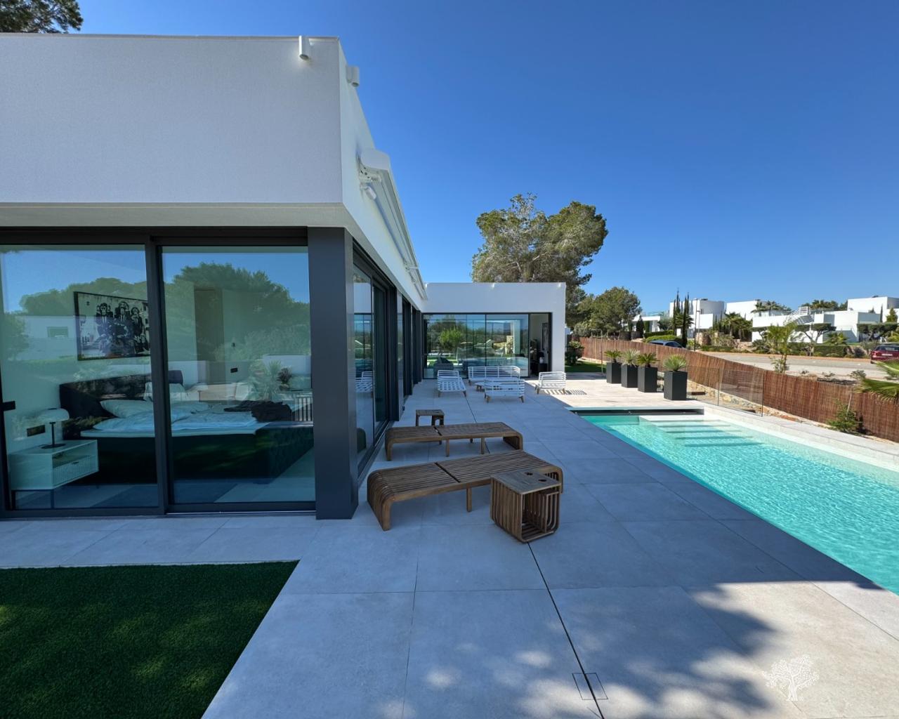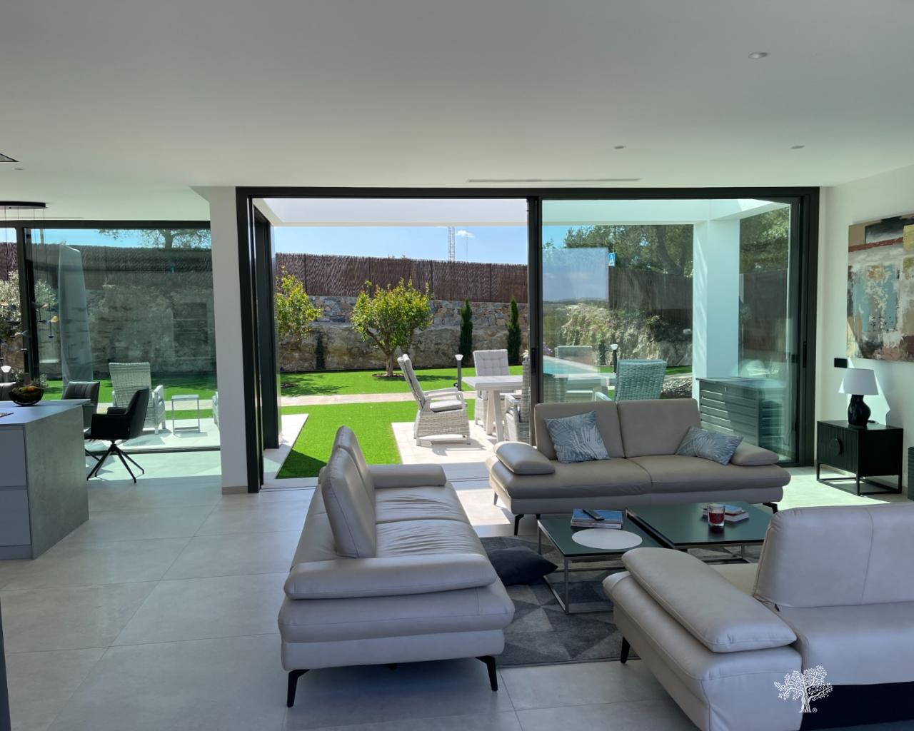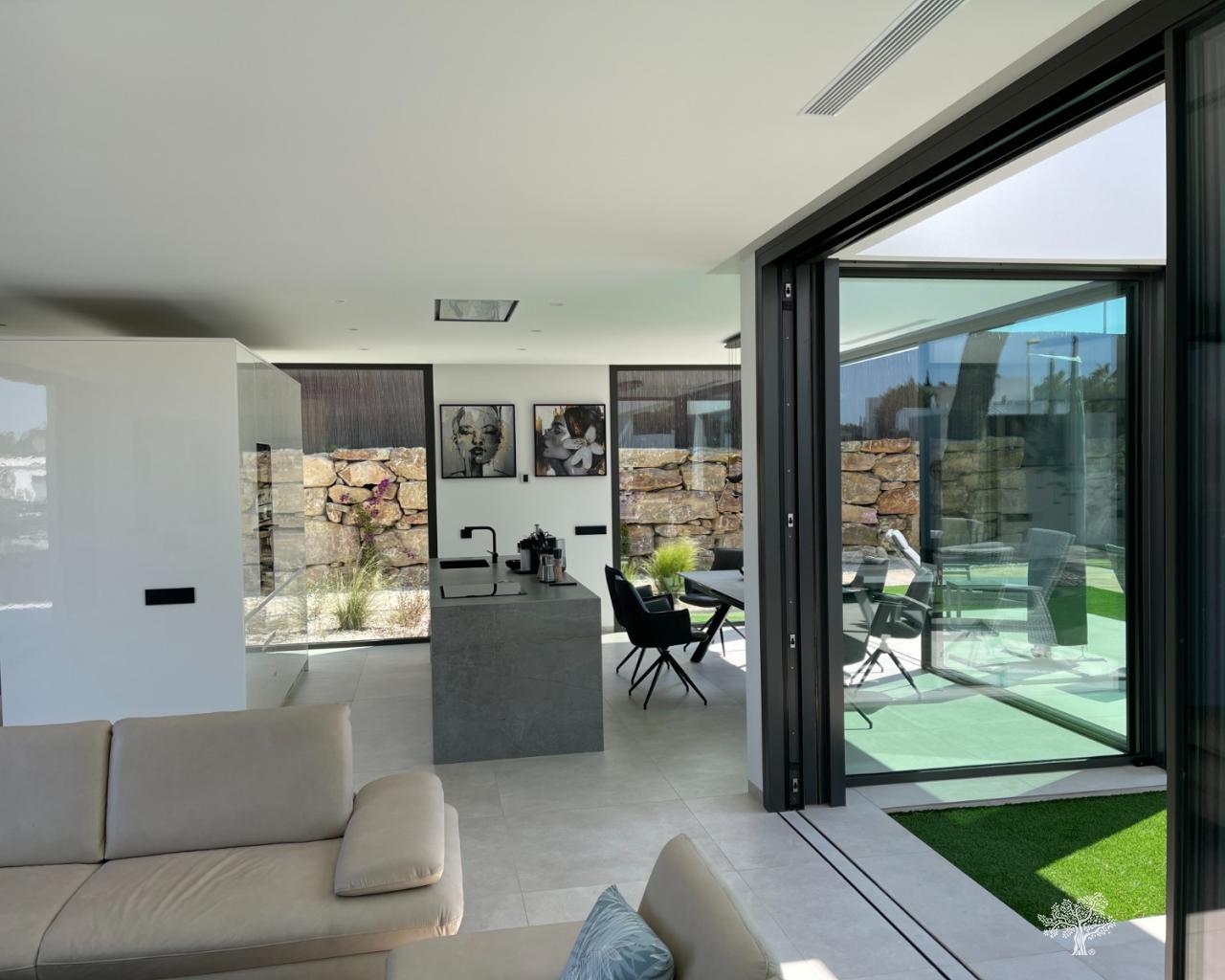 Villa Enebro de estilo moderno con 3 dormitorios, 2 baños, piscina privada, jardín paisajístico y garaje subterráneo. Situada en el corazón de Las Colinas Golf, a poca distancia de la casa club, el campo de golf y todos los servicios locales. Rodeada de bosque mediterráneo y del galardonado campo de golf de 18 hoyos. Con seguridad adicional en la isla central de este exclusivo resort, esta villa se encuentra en la mejor zona residencial. Amueblada y decorada con los más altos estándares, con electrodomésticos de alta gama en la cocina, piscina de lujo con cubierta y bomba de calor. Plaza de garaje para 1 o 2 coches y aparcamiento adicional para amigos o visitas justo fuera de la comunidad. Aire acondicionado frío-calor en todas las habitaciones con control por zonas, suelo radiante en la planta principal y luces LED en todas las habitaciones son solo algunas de sus características.