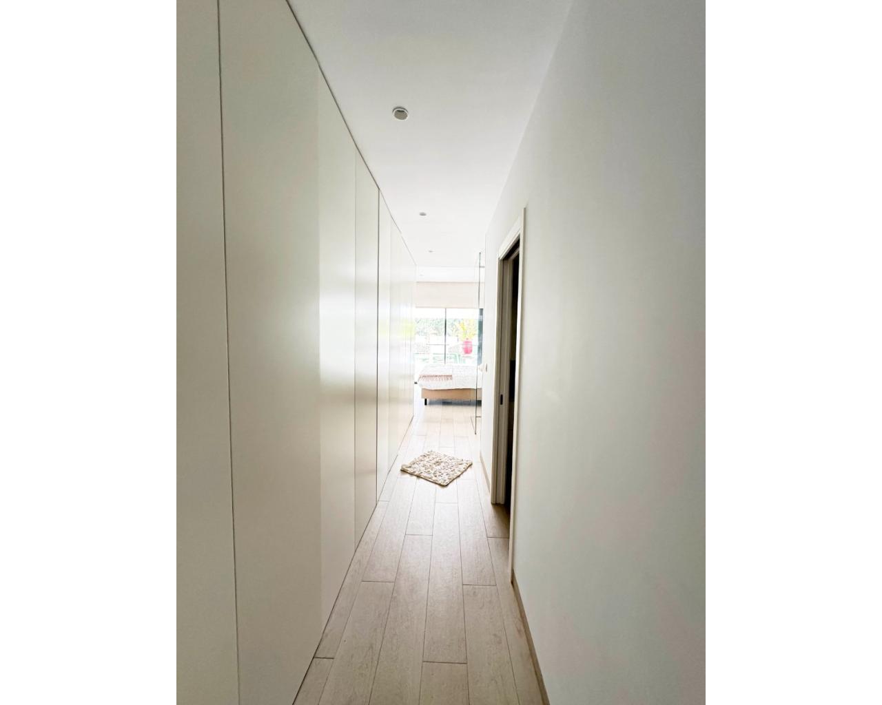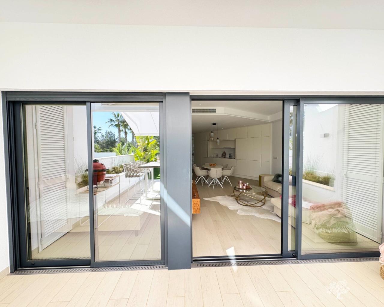 El interior ha sido diseñado con un acabado de lujo con equipamiento de primera calidad. La distribución consta de un vestíbulo de entrada que conduce al luminoso y espacioso salón de planta abierta y comedor con grandes ventanales con vistas a la terraza y al jardín. Dentro de la sala de estar principal es una cocina americana totalmente equipada acabado en blanco con un diseño elegante característica donde el área de preparación de alimentos puede ser totalmente cerrado cuando no esté en uso. El gran dormitorio principal incluye un cuarto de baño con ducha de lluvia, armarios empotrados, y también tiene acceso a la terraza principal. Hay otros dos dormitorios dobles de buen tamaño con vistas al paisaje verde en la parte trasera de la propiedad, ambos dormitorios incluyen armarios empotrados, y hay un baño de invitados con ducha de lluvia. La propiedad ha sido diseñada y decorada con buen gusto con tonos neutros, incluyendo azulejos de color madera clara en todo el apartamento que se extienden a la terraza que une los espacios interiores y exteriores en uno. La propiedad se vende completamente amueblada, e incluye instalación completa de aire acondicionado, calefacción por suelo radiante en ambos baños, sistema de domótica con Domótica, persianas interiores eléctricas, y aparcamiento subterráneo privado con trastero.