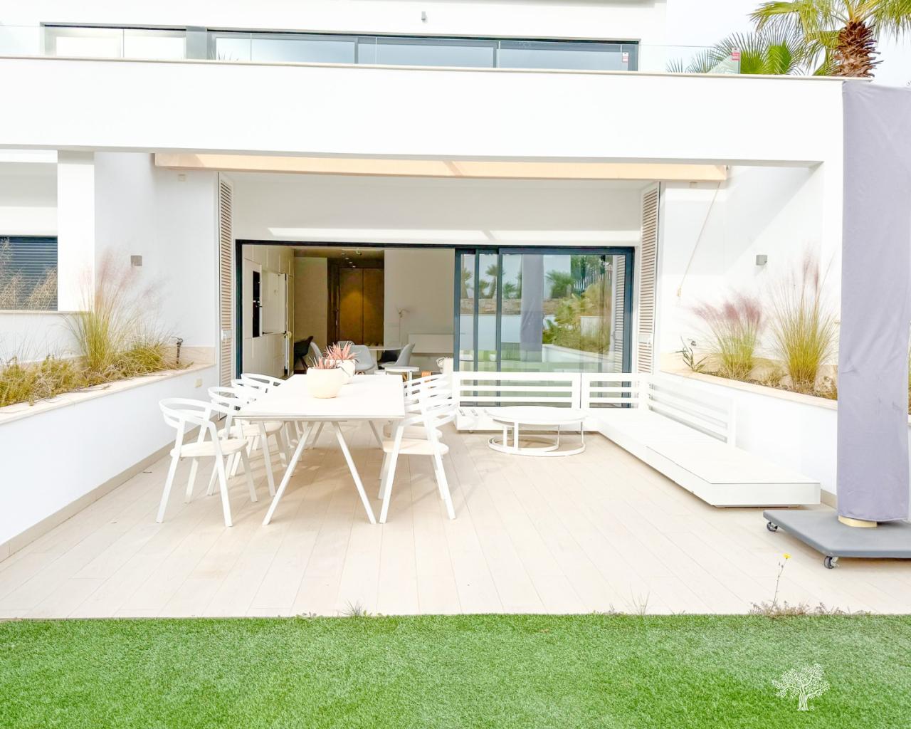 El interior ha sido diseñado con un acabado de lujo con equipamiento de primera calidad. La distribución consta de un vestíbulo de entrada que conduce al luminoso y espacioso salón de planta abierta y comedor con grandes ventanales con vistas a la terraza y al jardín. Dentro de la sala de estar principal es una cocina americana totalmente equipada acabado en blanco con un diseño elegante característica donde el área de preparación de alimentos puede ser totalmente cerrado cuando no esté en uso. El gran dormitorio principal incluye un cuarto de baño con ducha de lluvia, armarios empotrados, y también tiene acceso a la terraza principal. Hay otros dos dormitorios dobles de buen tamaño con vistas al paisaje verde en la parte trasera de la propiedad, ambos dormitorios incluyen armarios empotrados, y hay un baño de invitados con ducha de lluvia. La propiedad ha sido diseñada y decorada con buen gusto con tonos neutros, incluyendo azulejos de color madera clara en todo el apartamento que se extienden a la terraza que une los espacios interiores y exteriores en uno. La propiedad se vende completamente amueblada, e incluye instalación completa de aire acondicionado, calefacción por suelo radiante en ambos baños, sistema de domótica con Domótica, persianas interiores eléctricas, y aparcamiento subterráneo privado con trastero.
