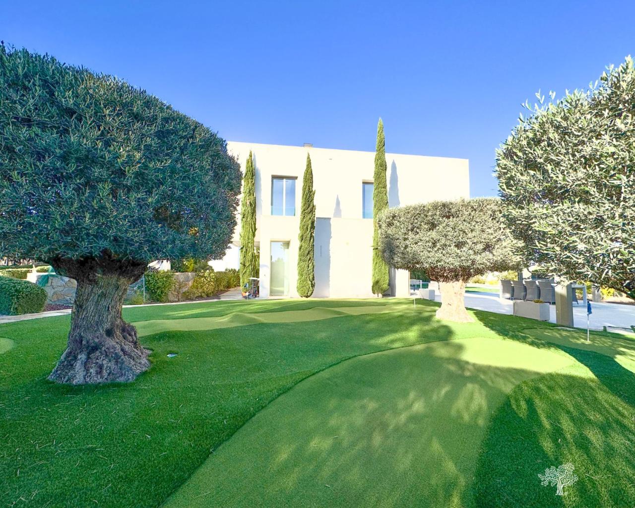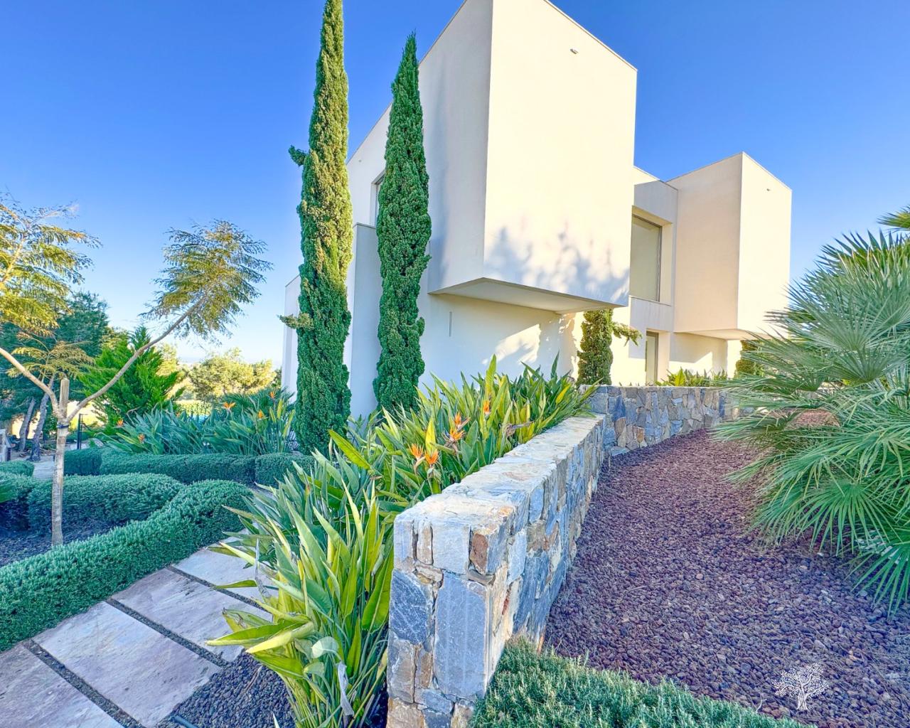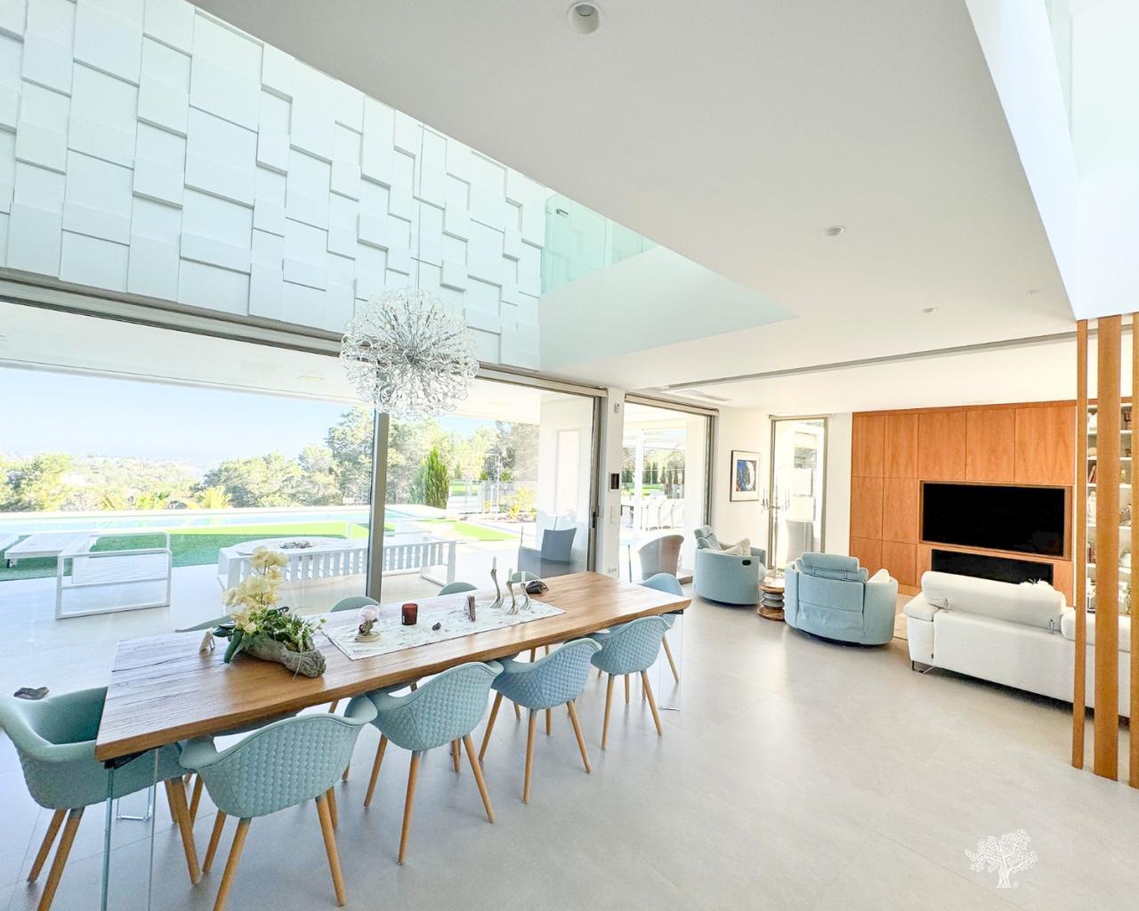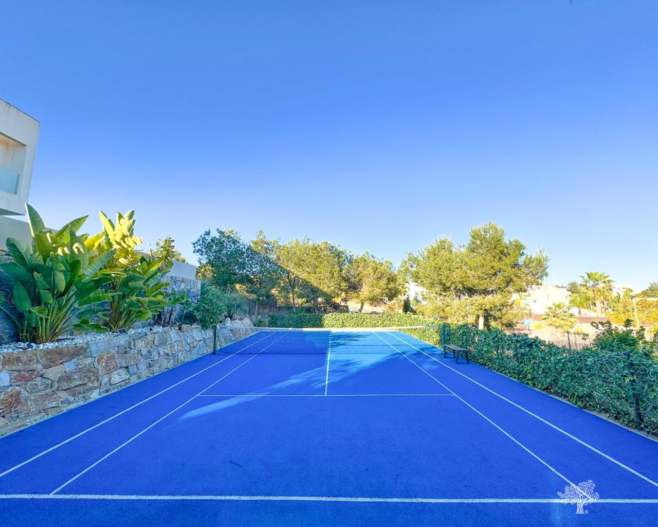 Preciosa villa independiente de estilo moderno situada en la comunidad de olivo con piscina privada, amplio jardín y pista de tenis privada. Esta villa consta de 5 dormitorios, 4 baños + aseo de invitados, piscina privada con cubierta automática y bomba de calefacción, garaje y amplias terrazas con vistas abiertas al mar. La parcela ofrece más de 1765m2 con una construcción de 436m2 y terrazas de 176m2. Ubicación muy privada y tranquila dentro de la comunidad de Olivo. La villa está construida en dos niveles + sótano y garaje con vistas al mar desde el primer piso y también desde la terraza principal. Esta villa se vende parcialmente amueblada e incluye muchos extras como sistema de hogar inteligente, persianas eléctricas, aire acondicionado con zona de aire, calefacción por suelo radiante en ambos niveles (primer y bajo) de la casa y cubierta eléctrica y bomba de calefacción para la piscina privada. Jardín paisajístico en diferentes niveles con cancha de tenis privada, campo de petanca, zona de estar privada con pérgola y horno de pizza. Bodega y Gimnasio en el sótano así como la 5ª habitación de la casa con baño en suite y terraza privada.