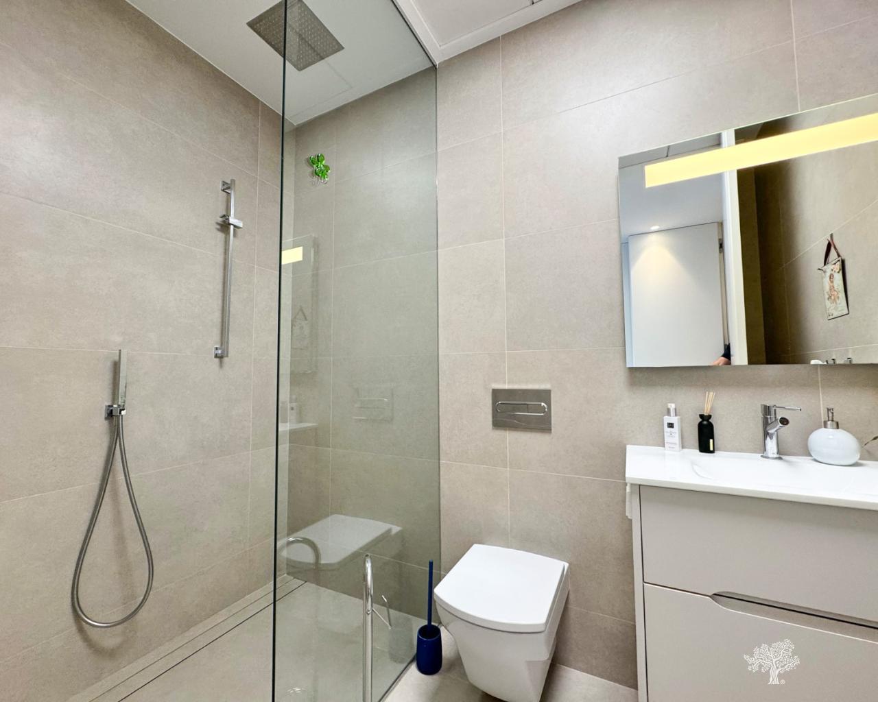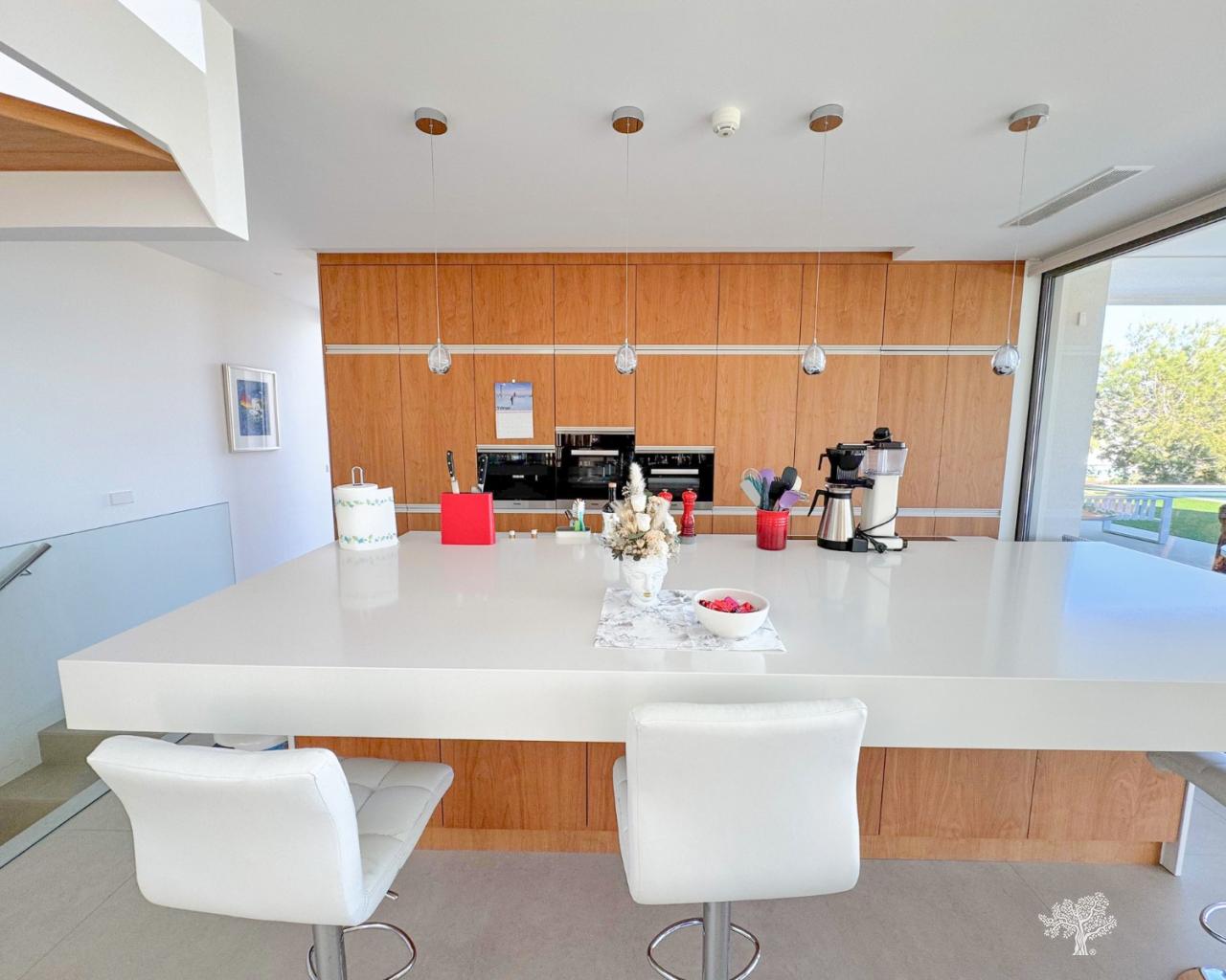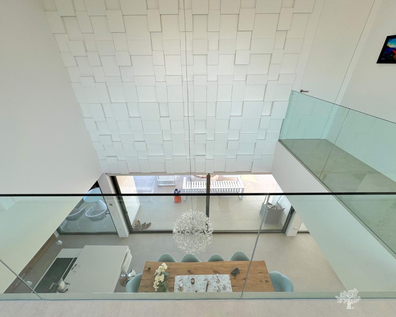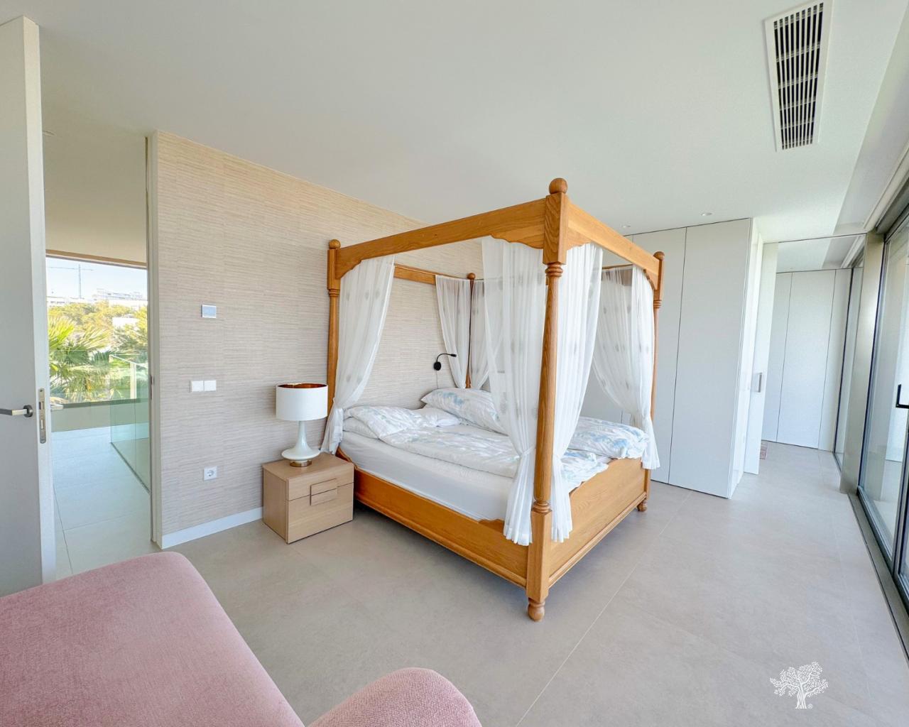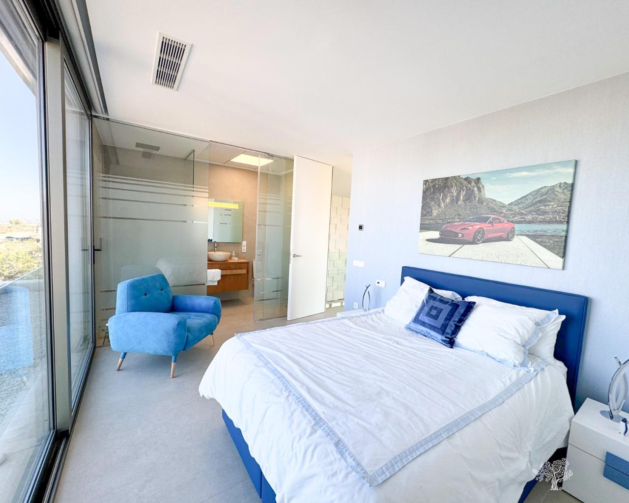 Preciosa villa independiente de estilo moderno situada en la comunidad de olivo con piscina privada, amplio jardín y pista de tenis privada. Esta villa consta de 5 dormitorios, 4 baños + aseo de invitados, piscina privada con cubierta automática y bomba de calefacción, garaje y amplias terrazas con vistas abiertas al mar. La parcela ofrece más de 1765m2 con una construcción de 436m2 y terrazas de 176m2. Ubicación muy privada y tranquila dentro de la comunidad de Olivo. La villa está construida en dos niveles + sótano y garaje con vistas al mar desde el primer piso y también desde la terraza principal. Esta villa se vende parcialmente amueblada e incluye muchos extras como sistema de hogar inteligente, persianas eléctricas, aire acondicionado con zona de aire, calefacción por suelo radiante en ambos niveles (primer y bajo) de la casa y cubierta eléctrica y bomba de calefacción para la piscina privada. Jardín paisajístico en diferentes niveles con cancha de tenis privada, campo de petanca, zona de estar privada con pérgola y horno de pizza. Bodega y Gimnasio en el sótano así como la 5ª habitación de la casa con baño en suite y terraza privada.
