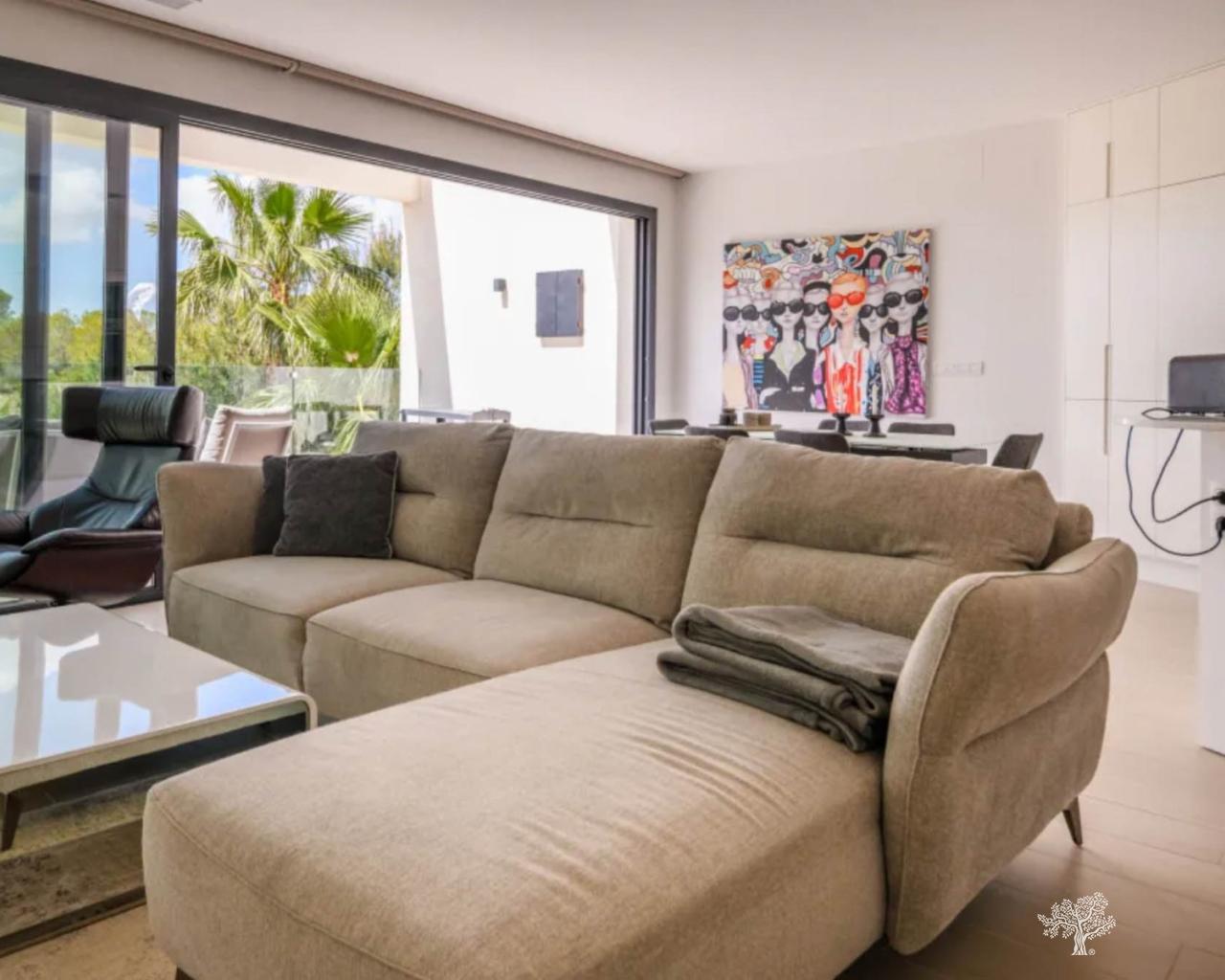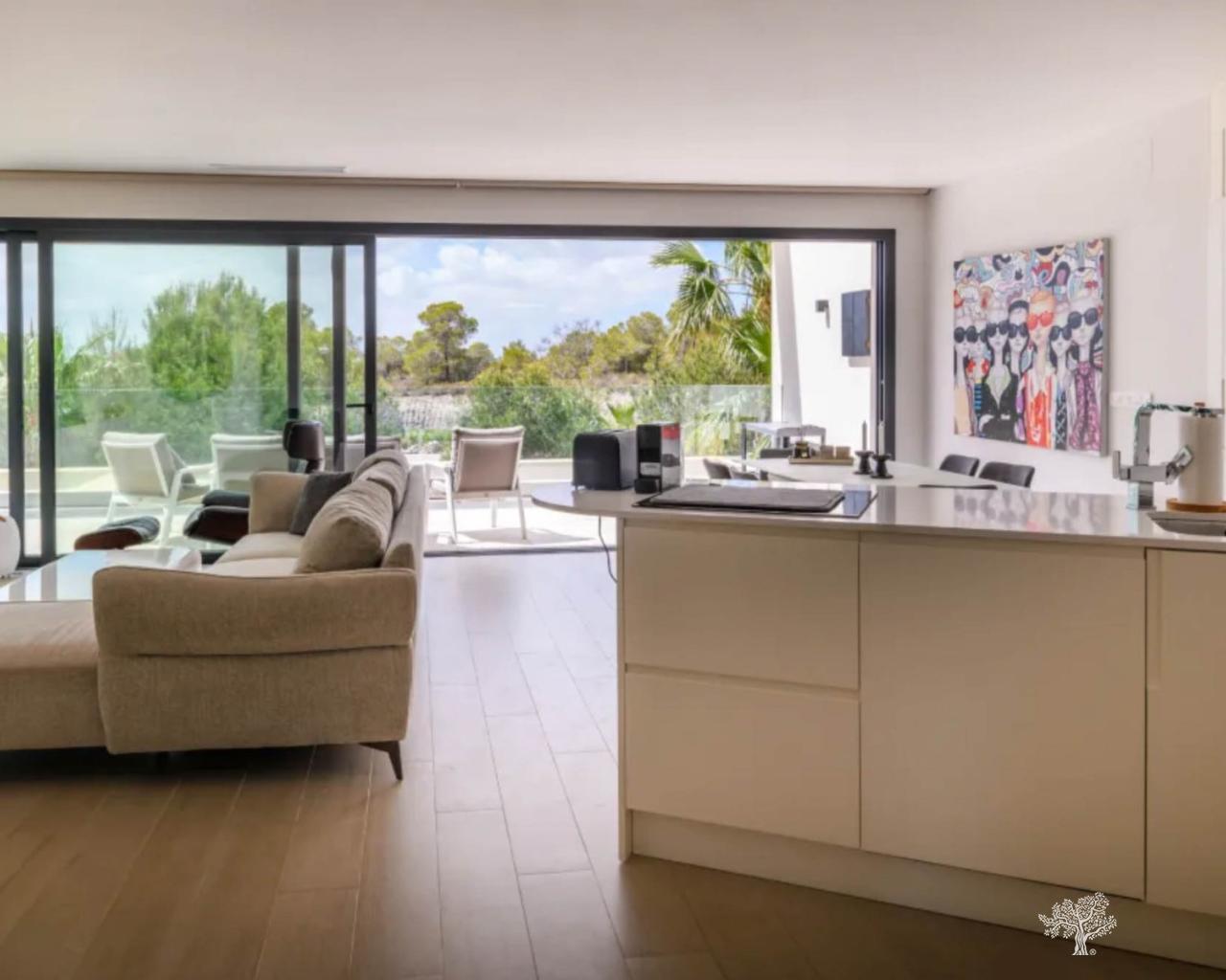 Hermoso y muy lujosamente terminado apartamento de tres dormitorios y dos baños en el primer piso, aparcamiento privado y trastero en el garaje subterráneo, y una amplia terraza orientada al sur de 30 metros cuadrados, situado a sólo 50 minutos al sur de Alicante Airport.Entering el edificio Hinojo II, ya sea desde el garaje subterráneo o puerta, por ascensor o escaleras, se llega a la primera planta que conduce a sólo esta unidad de apartamento, creando privacidad y tranquilidad adicional. Al entrar en el apartamento, uno se encuentra inmediatamente en la luminosa y espaciosa cocina abierta y sala de estar orientada al sur. El salón cuenta con mucho espacio de almacenamiento y la cocina está totalmente equipada con marcas de lujo y características tales como un microondas Bosch, horno, placa de inducción, lavadora-secadora combo, lavavajillas, frigorífico Siemens, campana extractora montada en el techo, y dispensador de agua potable. Desde la planta abierta, se accede a la terraza a través de puertas correderas que se pueden abrir desde ambos lados. Las baldosas de color madera clara de todo el apartamento se extienden también a la terraza. La terraza incluye tomas de electricidad y televisión, un grifo de agua exterior y la posibilidad de montar e instalar toldos eléctricos (persianas). Desde el salón se accede al espacioso dormitorio principal con una vista única sobre las palmeras. El dormitorio principal incluye un amplio cuarto de baño privado con ducha de lluvia, mucho espacio de almacenamiento, un escritorio y acceso directo a la terraza a través de puertas correderas. Desde el salón se accede al segundo y tercer dormitorio y al segundo cuarto de baño a través de una impresionante puerta pivotante hecha a medida. Los dormitorios son de idéntico tamaño y diseño, con vistas a un hermoso paisaje verde, y contienen grandes armarios empotrados. El segundo cuarto de baño cuenta con un azulejo único y ducha que incluye una ducha de lluvia. El apartamento está situado en el bloque I de la Comunidad cerrada Hinojo Fase II de Las Colinas. La Comunidad Hinojo se encuentra en algunos de los terrenos más altos de Las Colinas, con vistas al bosque mediterráneo y las puestas de sol más impresionantes. El apartamento incluye una plaza de aparcamiento privado y trastero accesible directamente por ascensor desde el apartamento. Las zonas comunes de la Comunidad Hinojo II incluyen jardines, una piscina privada y zonas de relax, y una pista de petanca, rodeada de palmeras y vegetación autóctona.