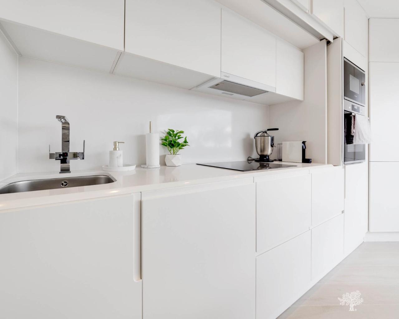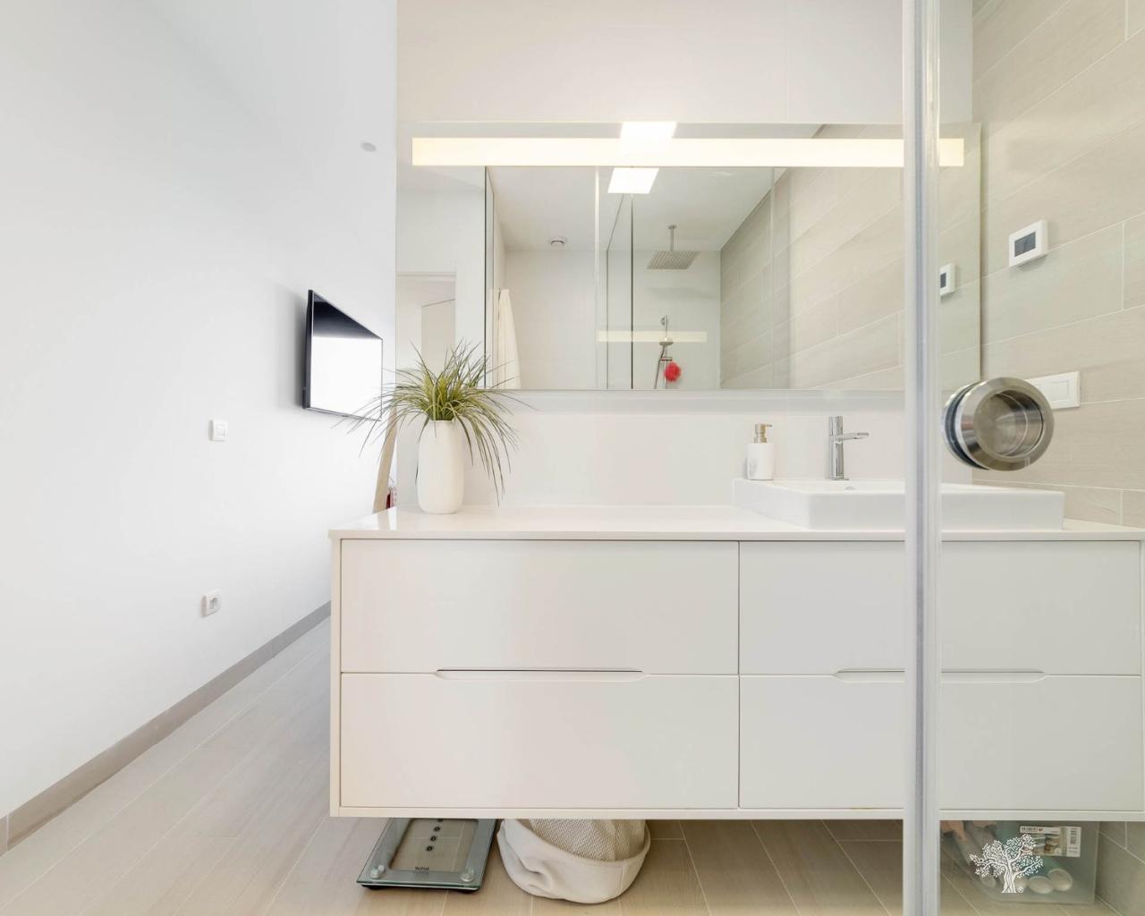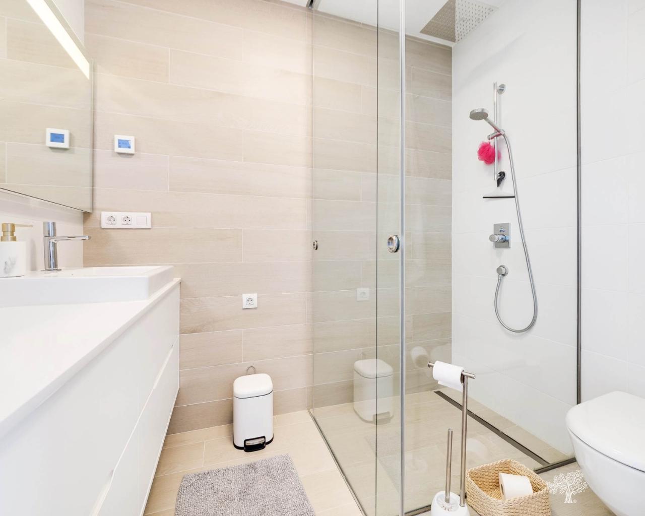 L'intérieur a été conçu avec une finition luxueuse et des équipements de première qualité. L'agencement se compose d'un salon et d'une salle à manger ouverts, lumineux et spacieux, avec de grandes fenêtres s'ouvrant sur la terrasse. Dans l'espace de vie principal se trouve une cuisine américaine entièrement équipée et finie en blanc, avec un design élégant où la zone de préparation des repas peut être entièrement fermée lorsqu'elle n'est pas utilisée. La grande chambre principale comprend une salle de bains attenante avec une douche à effet pluie et des armoires encastrées. Les deux chambres donnent sur le paysage verdoyant à l'arrière de la propriété, et il y a une salle de bains séparée pour les invités avec une douche à effet de pluie. La propriété a été conçue et décorée avec goût dans des tons neutres, y compris des carreaux de couleur bois clair dans tout l'appartement qui s'étendent jusqu'à la terrasse qui réunit les espaces intérieurs et extérieurs. La propriété est vendue entièrement meublée et comprend l'installation complète de l'air conditionné, le chauffage au sol dans les deux salles de bains, le système de domotique avec Domotica, les stores intérieurs électriques et le parking souterrain privé avec salle de stockage.