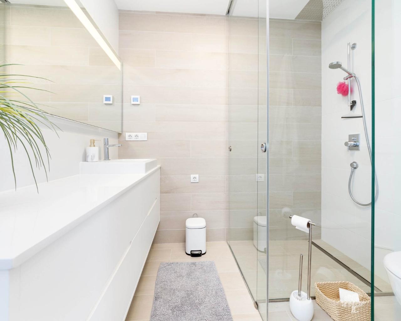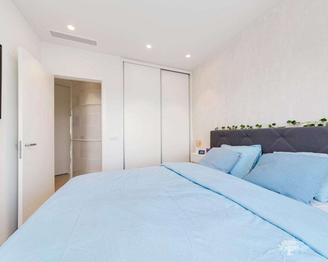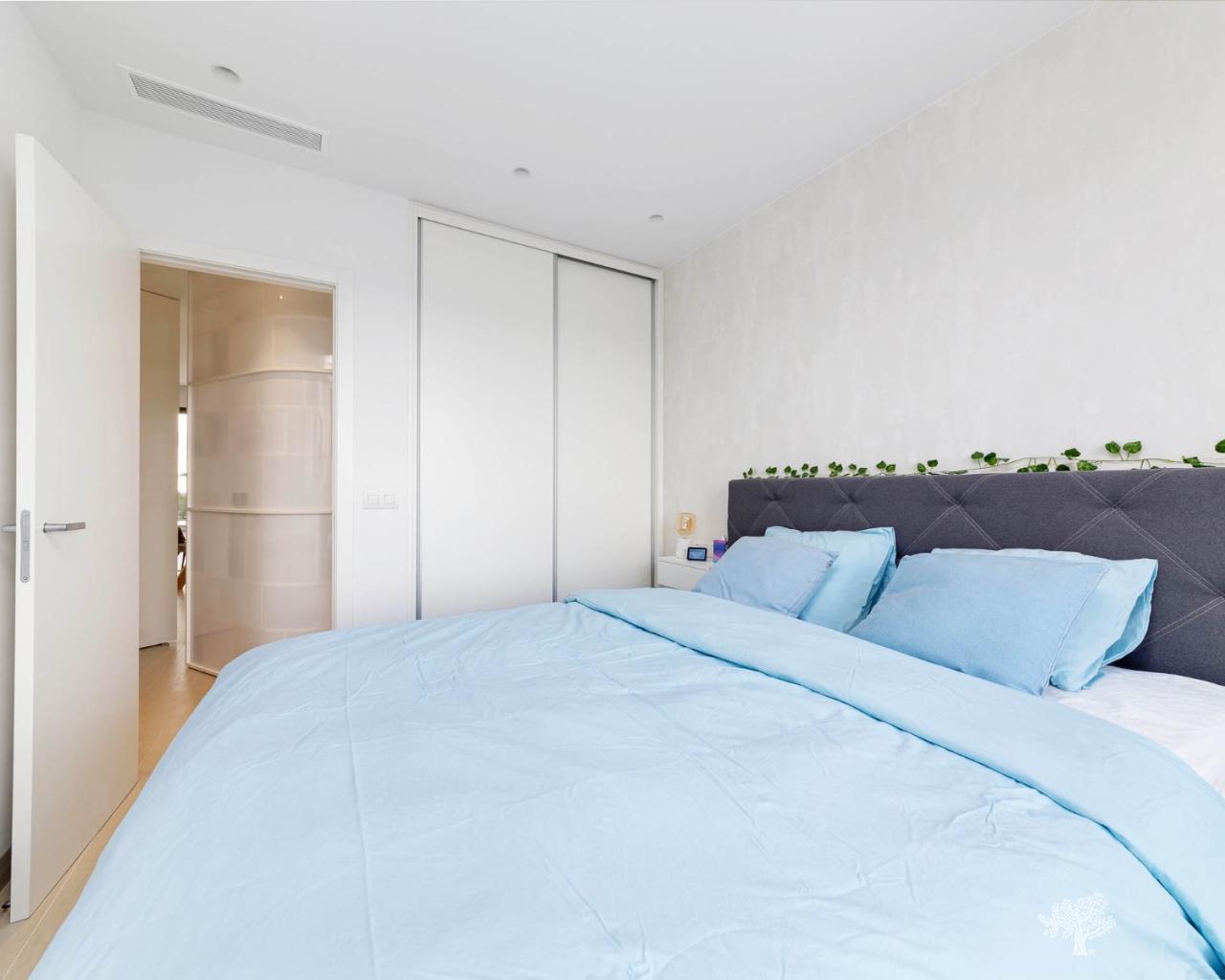 L'intérieur a été conçu avec une finition luxueuse et des équipements de première qualité. L'agencement se compose d'un salon et d'une salle à manger ouverts, lumineux et spacieux, avec de grandes fenêtres s'ouvrant sur la terrasse. Dans l'espace de vie principal se trouve une cuisine américaine entièrement équipée et finie en blanc, avec un design élégant où la zone de préparation des repas peut être entièrement fermée lorsqu'elle n'est pas utilisée. La grande chambre principale comprend une salle de bains attenante avec une douche à effet pluie et des armoires encastrées. Les deux chambres donnent sur le paysage verdoyant à l'arrière de la propriété, et il y a une salle de bains séparée pour les invités avec une douche à effet de pluie. La propriété a été conçue et décorée avec goût dans des tons neutres, y compris des carreaux de couleur bois clair dans tout l'appartement qui s'étendent jusqu'à la terrasse qui réunit les espaces intérieurs et extérieurs. La propriété est vendue entièrement meublée et comprend l'installation complète de l'air conditionné, le chauffage au sol dans les deux salles de bains, le système de domotique avec Domotica, les stores intérieurs électriques et le parking souterrain privé avec salle de stockage.