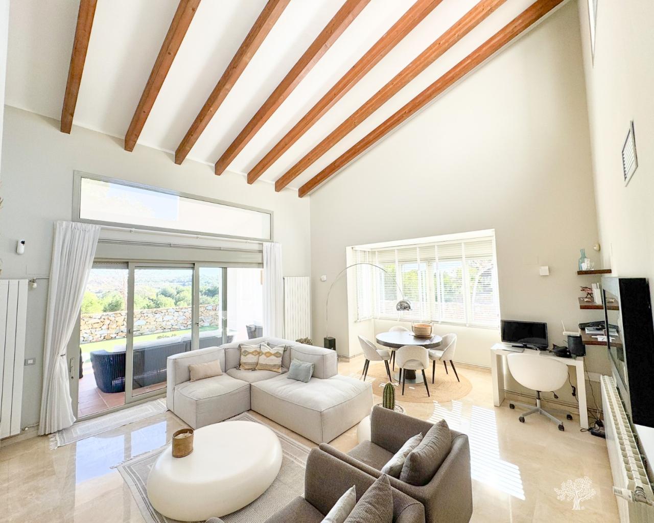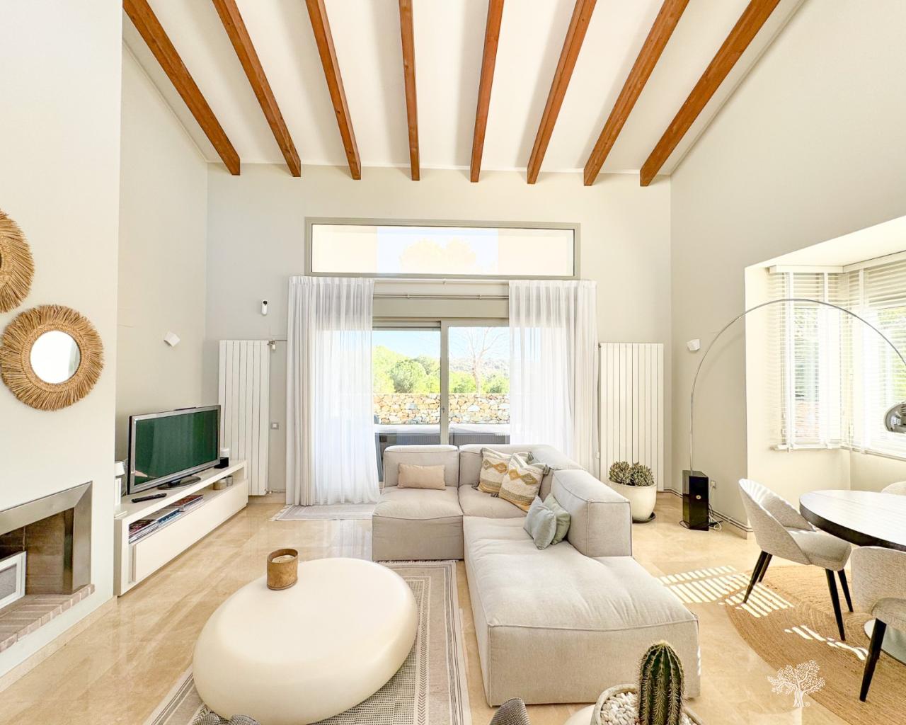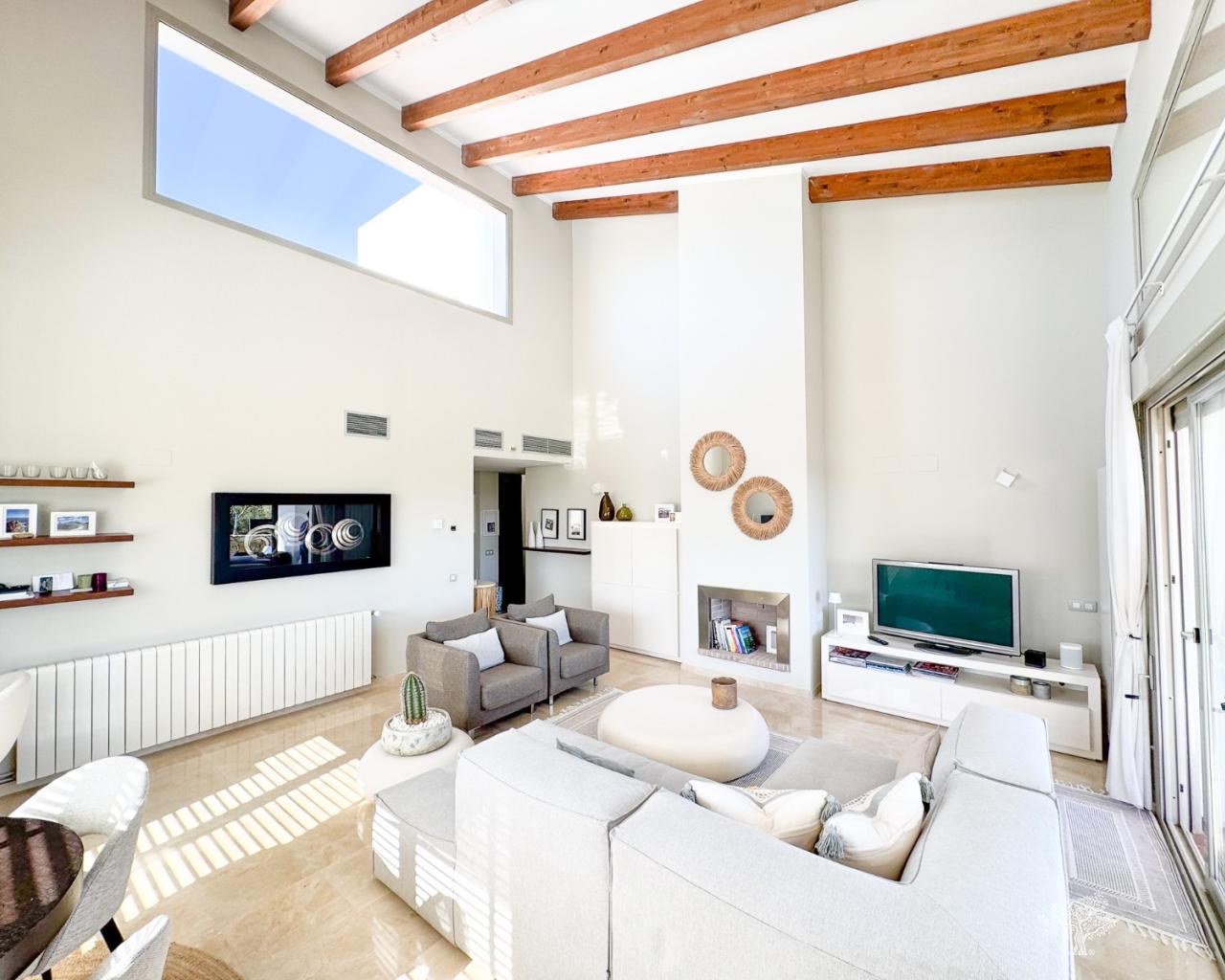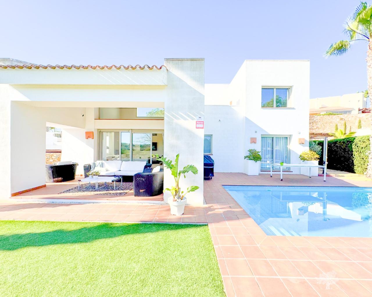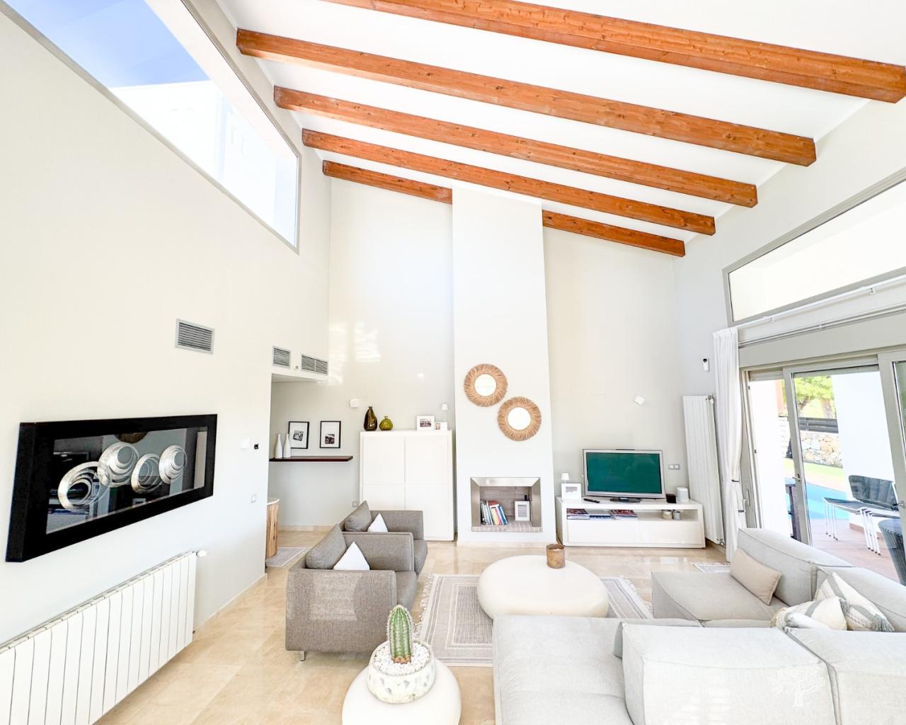 Villa individuelle de style traditionnel avec piscine privée et vue imprenable sur le golf, située dans le domaine Jacaranda, à Las Colinas Golf. Elle comprend 4 chambres, 3 salles de bains, un WC invités, de vastes terrasses et un jardin paysager. D'une superficie de 190 m² répartie sur deux niveaux, elle est équipée d'un chauffage central au gaz, de la climatisation réversible et d'une cheminée. Un placard de rangement se trouve à proximité du parking couvert privé. Des panneaux solaires installés sur le toit optimisent l'efficacité énergétique. Située sur un terrain privé au sein de ce petit domaine, elle se trouve au cœur du Las Colinas Golf & Country Club. Le club-house et tous les commerces et services sont à seulement 5 minutes à pied.