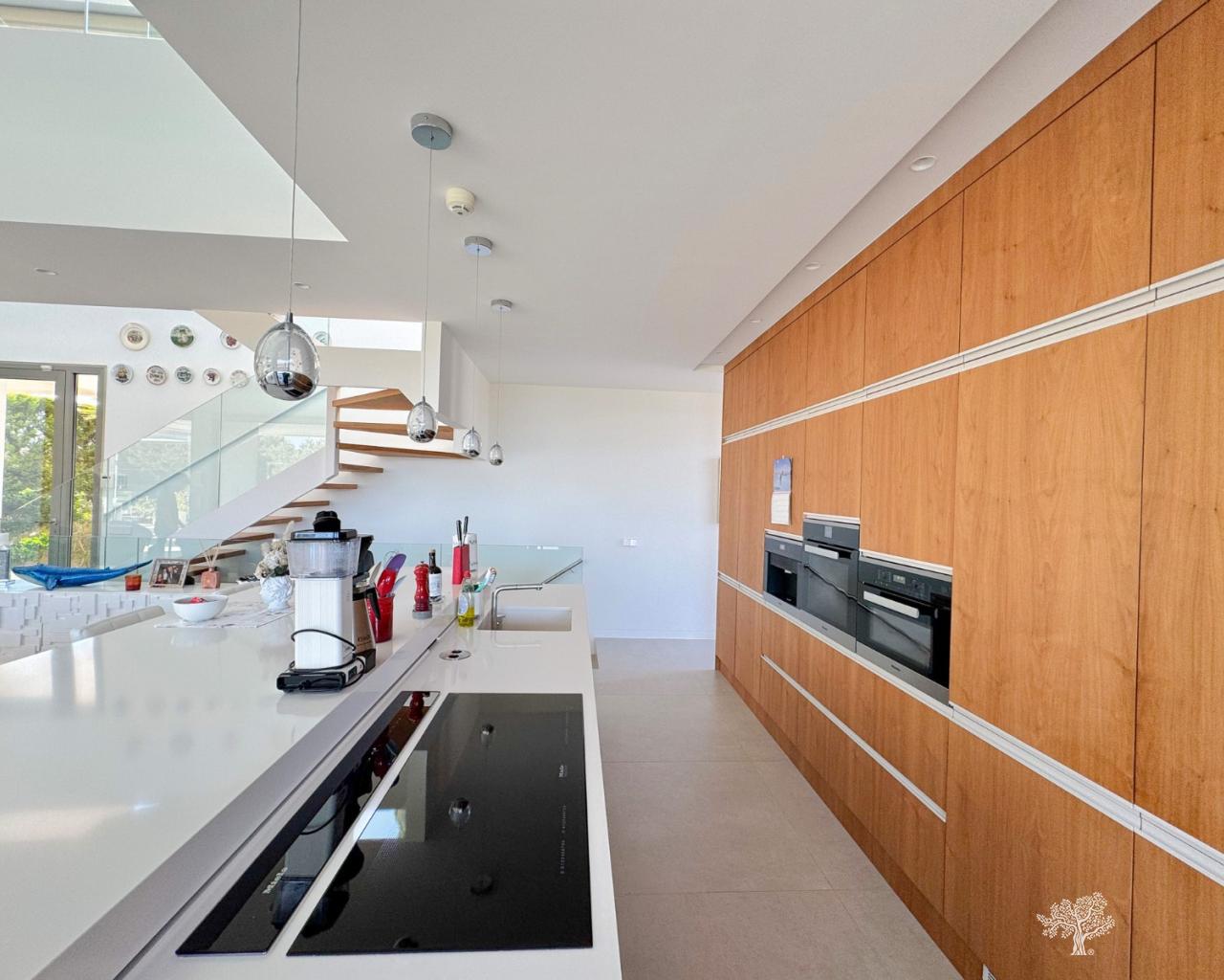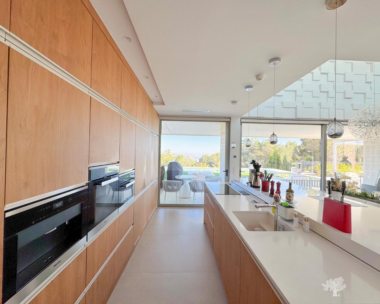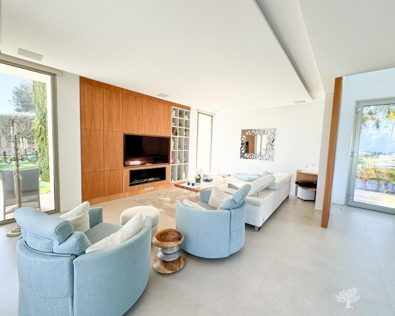 Belle villa individuelle de style moderne située dans la communauté d'Olivo avec piscine privée, grand jardin et court de tennis privé. Cette villa se compose de 5 chambres, 4 salles de bains + toilettes invités, piscine privée avec couverture automatique et pompe à chaleur, garage et terrasses spacieuses avec vue dégagée sur la mer. Le terrain offre plus de 1765 m2 avec une construction de 436 m2 et 176 m2 de terrasses. Emplacement très privé et calme au sein de la communauté Olivo. La villa est construite sur deux niveaux + sous-sol et garage avec vue mer depuis le 1er étage et la terrasse principale également. Cette villa est vendue partiellement meublée et comprend de nombreux extras tels qu'un système de maison intelligente, des stores électriques, la climatisation avec zone d'air, le chauffage au sol aux deux niveaux (1er et rez-de-chaussée) de la maison et une couverture électrique et une pompe à chaleur pour la piscine privée. Jardin paysagé sur différents niveaux avec tennis privatif, terrain de pétanque, coin salon privatif avec pergola et four à pizza. Cave à vin et Salle de sport au sous-sol ainsi que la 5ème pièce de la maison avec salle de bain en suite et terrasse privée.