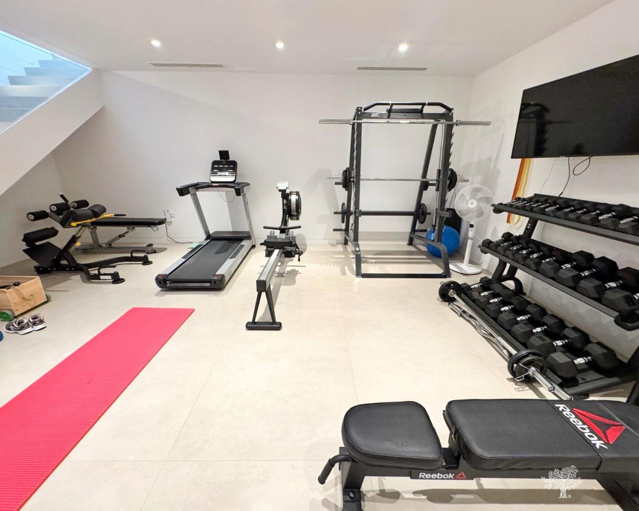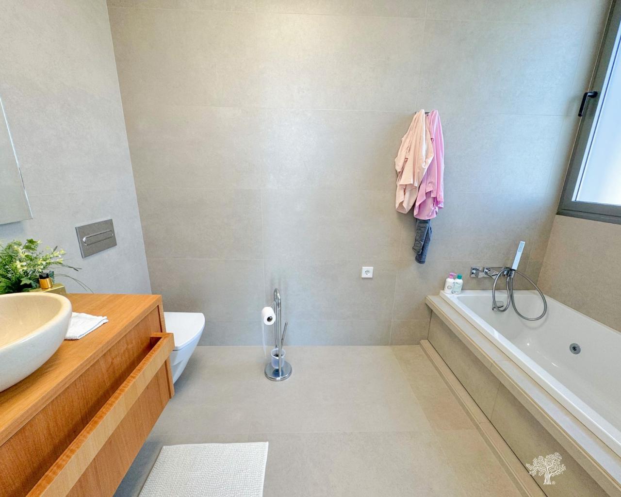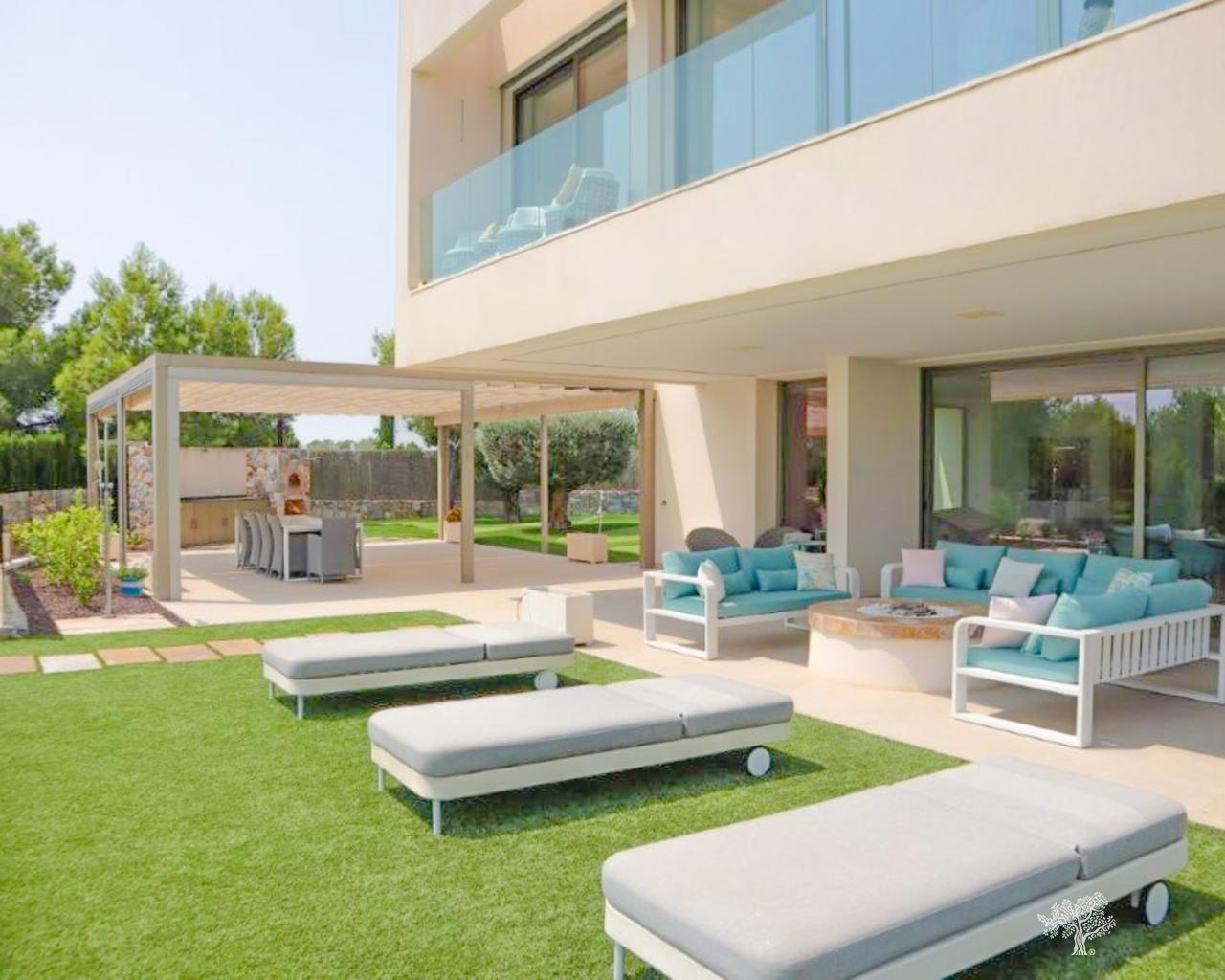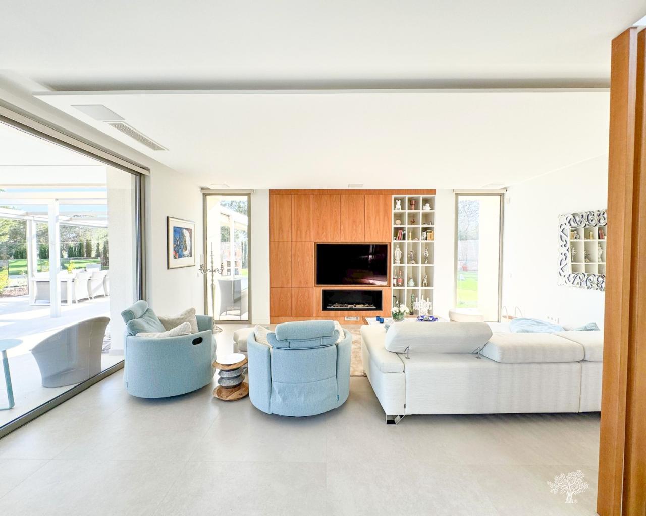 Belle villa individuelle de style moderne située dans la communauté d'Olivo avec piscine privée, grand jardin et court de tennis privé. Cette villa se compose de 5 chambres, 4 salles de bains + toilettes invités, piscine privée avec couverture automatique et pompe à chaleur, garage et terrasses spacieuses avec vue dégagée sur la mer. Le terrain offre plus de 1765 m2 avec une construction de 436 m2 et 176 m2 de terrasses. Emplacement très privé et calme au sein de la communauté Olivo. La villa est construite sur deux niveaux + sous-sol et garage avec vue mer depuis le 1er étage et la terrasse principale également. Cette villa est vendue partiellement meublée et comprend de nombreux extras tels qu'un système de maison intelligente, des stores électriques, la climatisation avec zone d'air, le chauffage au sol aux deux niveaux (1er et rez-de-chaussée) de la maison et une couverture électrique et une pompe à chaleur pour la piscine privée. Jardin paysagé sur différents niveaux avec tennis privatif, terrain de pétanque, coin salon privatif avec pergola et four à pizza. Cave à vin et Salle de sport au sous-sol ainsi que la 5ème pièce de la maison avec salle de bain en suite et terrasse privée.