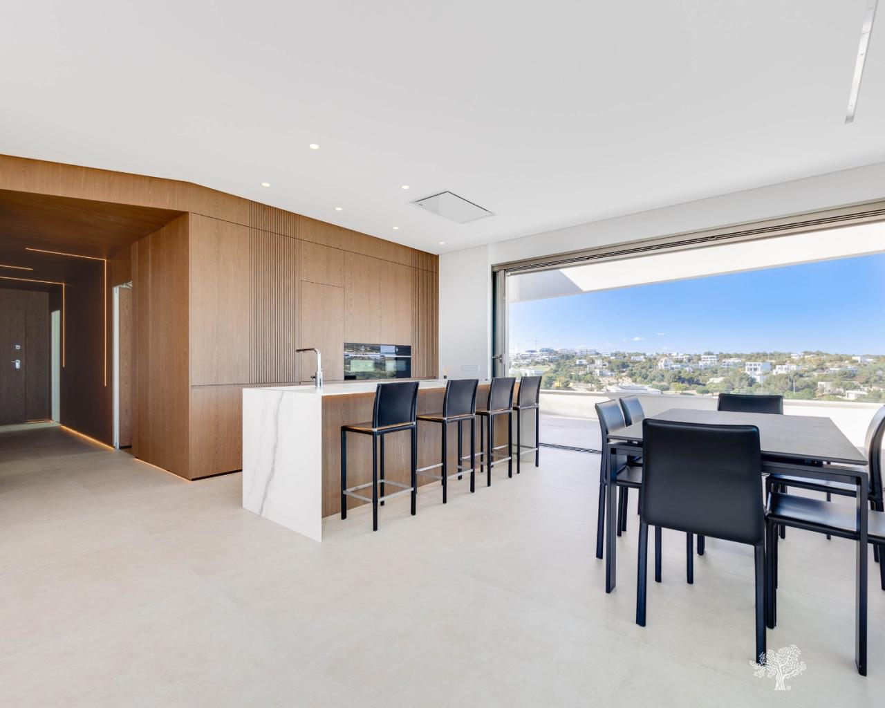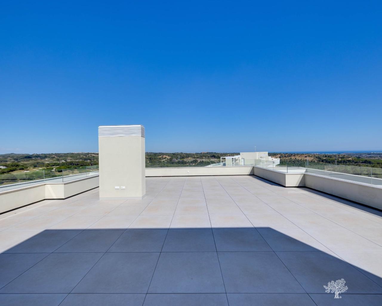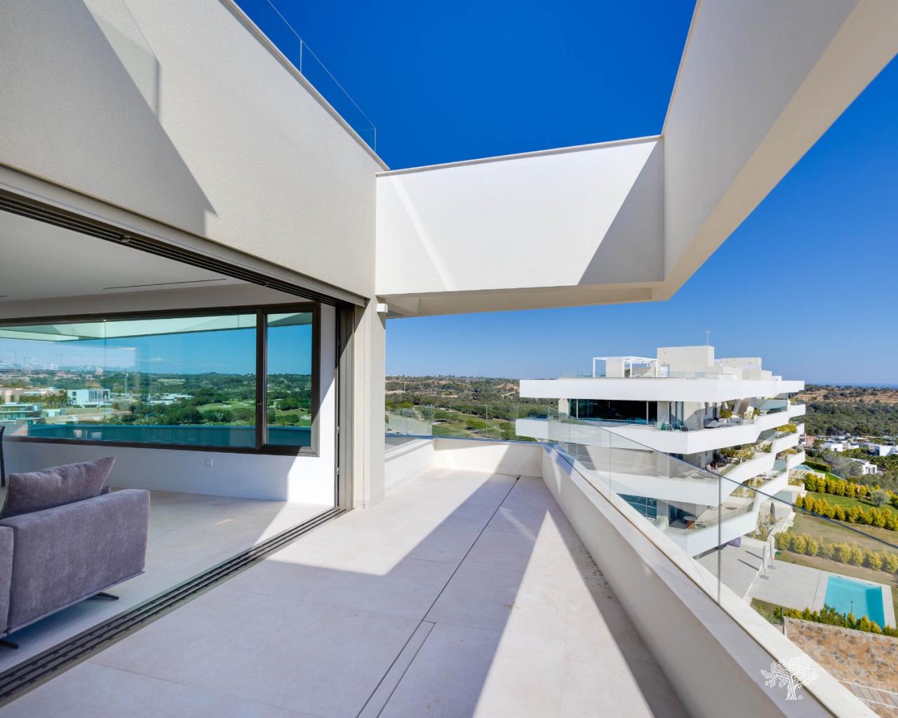 Penthouse de luxe avec 3 chambres, terrasse sur le toit, 2 places de parking en garage, rangements et une vue imprenable sur le golf et la mer à Las Colinas Golf, résidence Madroño II. Appartement d'angle avec 2 terrasses principales donnant sur la mer et le golf, offrant des prestations haut de gamme : climatisation réversible, chauffage au sol dans les salles de bains, volets roulants électriques dans les chambres, électroménager haut de gamme dans la cuisine et accès à une magnifique piscine et une salle de sport communes. Ce penthouse d'angle comprend 2 places de parking en garage souterrain ainsi qu'un espace de rangement. Finitions luxueuses et éléments en bois dans le salon/cuisine et les chambres, associés à un éclairage LED indirect, créent une ambiance apaisante.