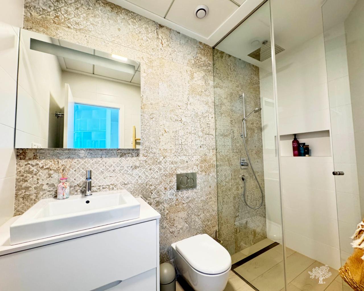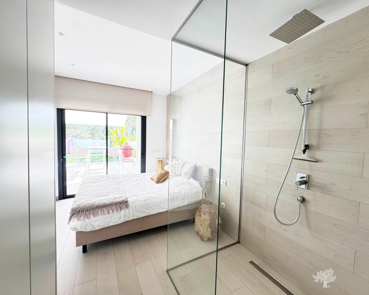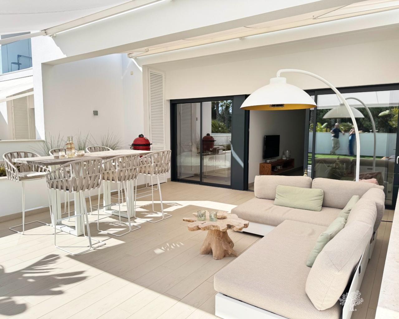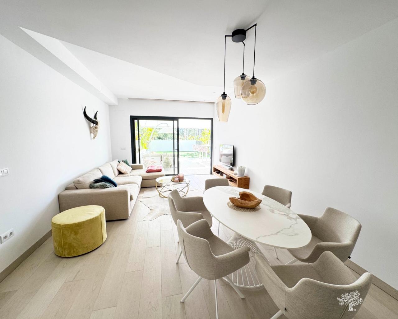 Het interieur is luxueus afgewerkt met apparatuur van topkwaliteit. De indeling bestaat uit een hal die leidt naar de lichte en ruime open woon- en eetkamer met grote ramen die uitkijken op het terras en de tuin. Binnen de belangrijkste leefruimte is een volledig uitgeruste Amerikaanse keuken afgewerkt in wit met een slanke design functie waar de voedselbereiding gebied kan volledig worden afgesloten wanneer niet in gebruik. De grote hoofdslaapkamer heeft een en-suite badkamer met regendouche, inbouwkasten en openslaande deuren naar het hoofdterras. Er zijn nog twee ruime slaapkamers met uitzicht op het groene landschap aan de achterkant van het pand, beide slaapkamers met ingebouwde kasten, en er is een aparte badkamer voor gasten met een regendouche. Het pand is smaakvol ontworpen en ingericht met neutrale tinten, waaronder lichte houtkleurige tegels in het hele appartement die doorlopen naar het terras dat de binnen- en buitenruimtes samenbrengt. De woning wordt volledig gemeubileerd verkocht en is inclusief volledige installatie van airconditioning, vloerverwarming in beide badkamers, domoticasysteem met Domotica, elektrische binnenzonwering en een ondergrondse privéparkeerplaats met berging.