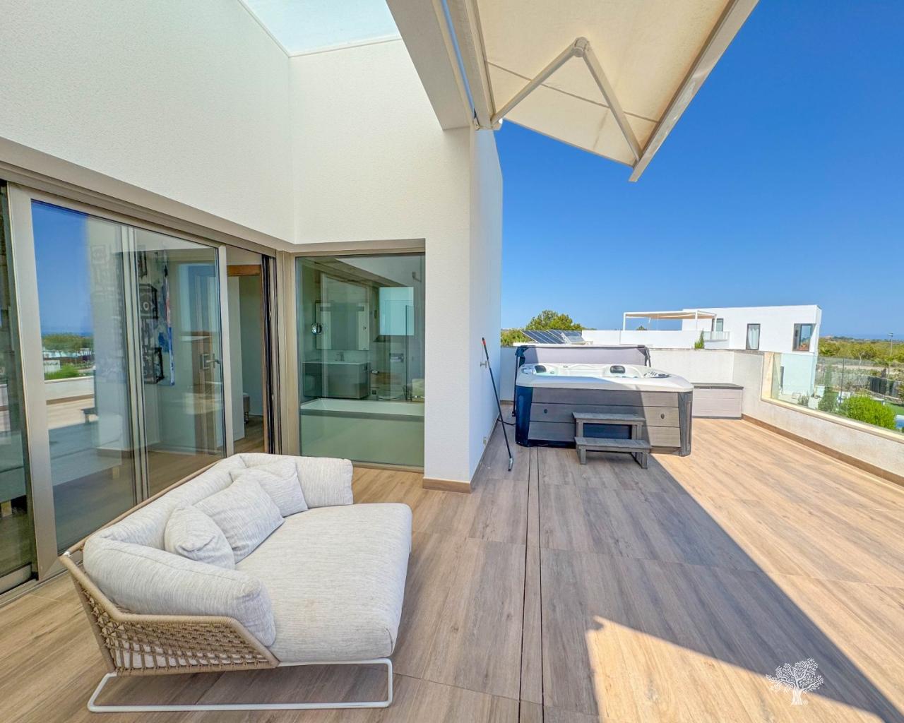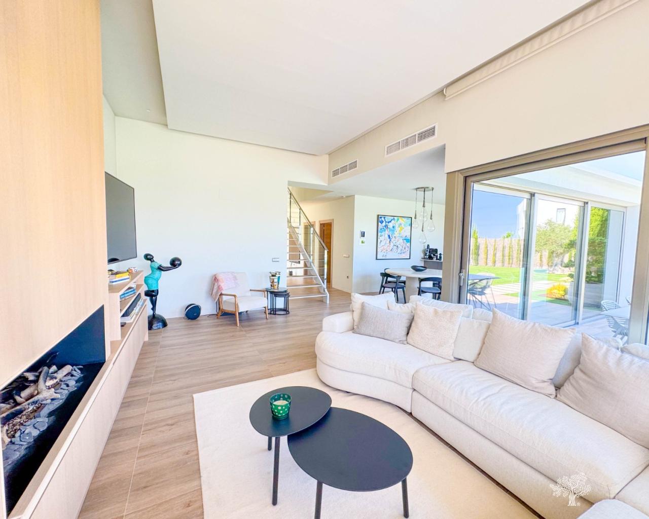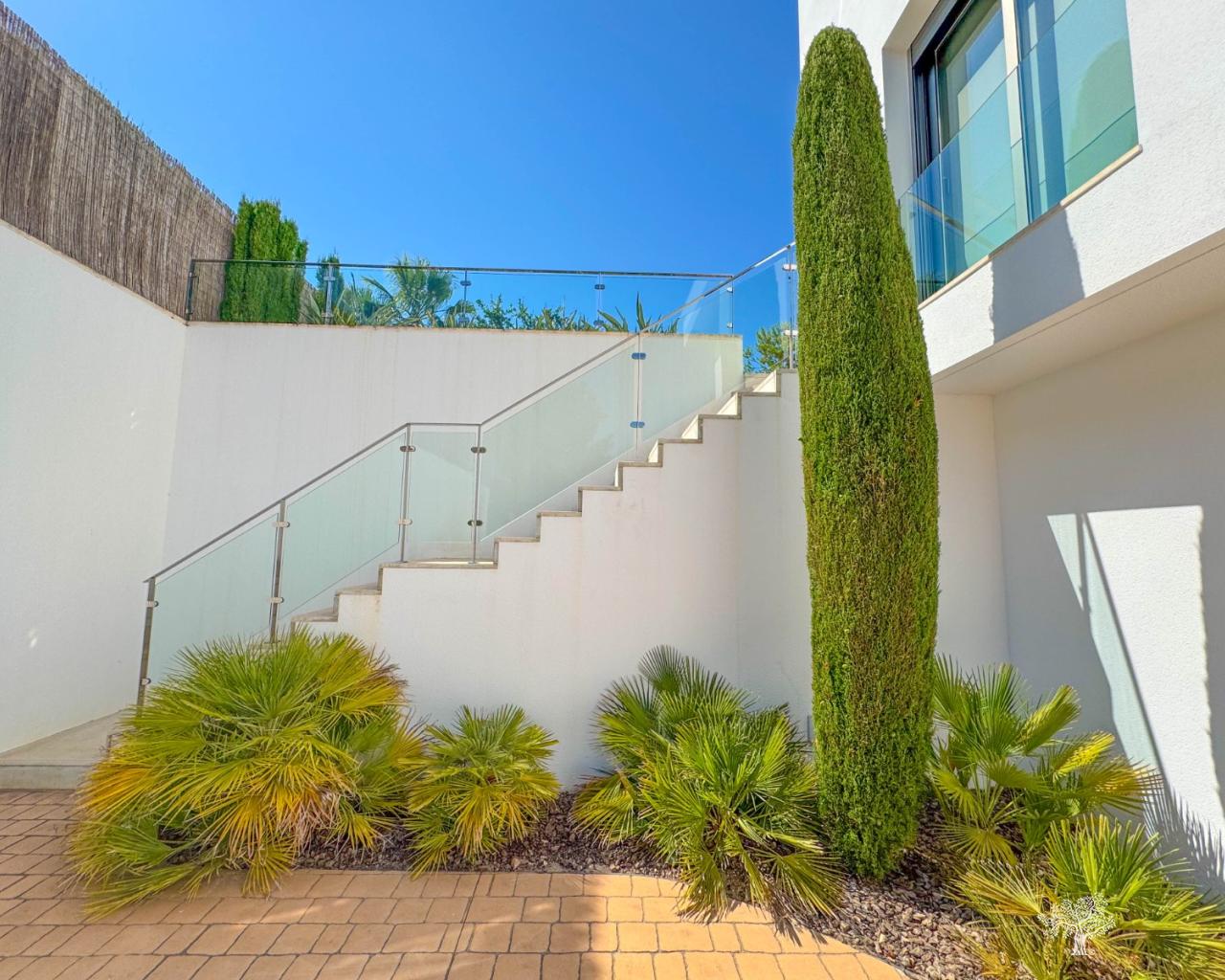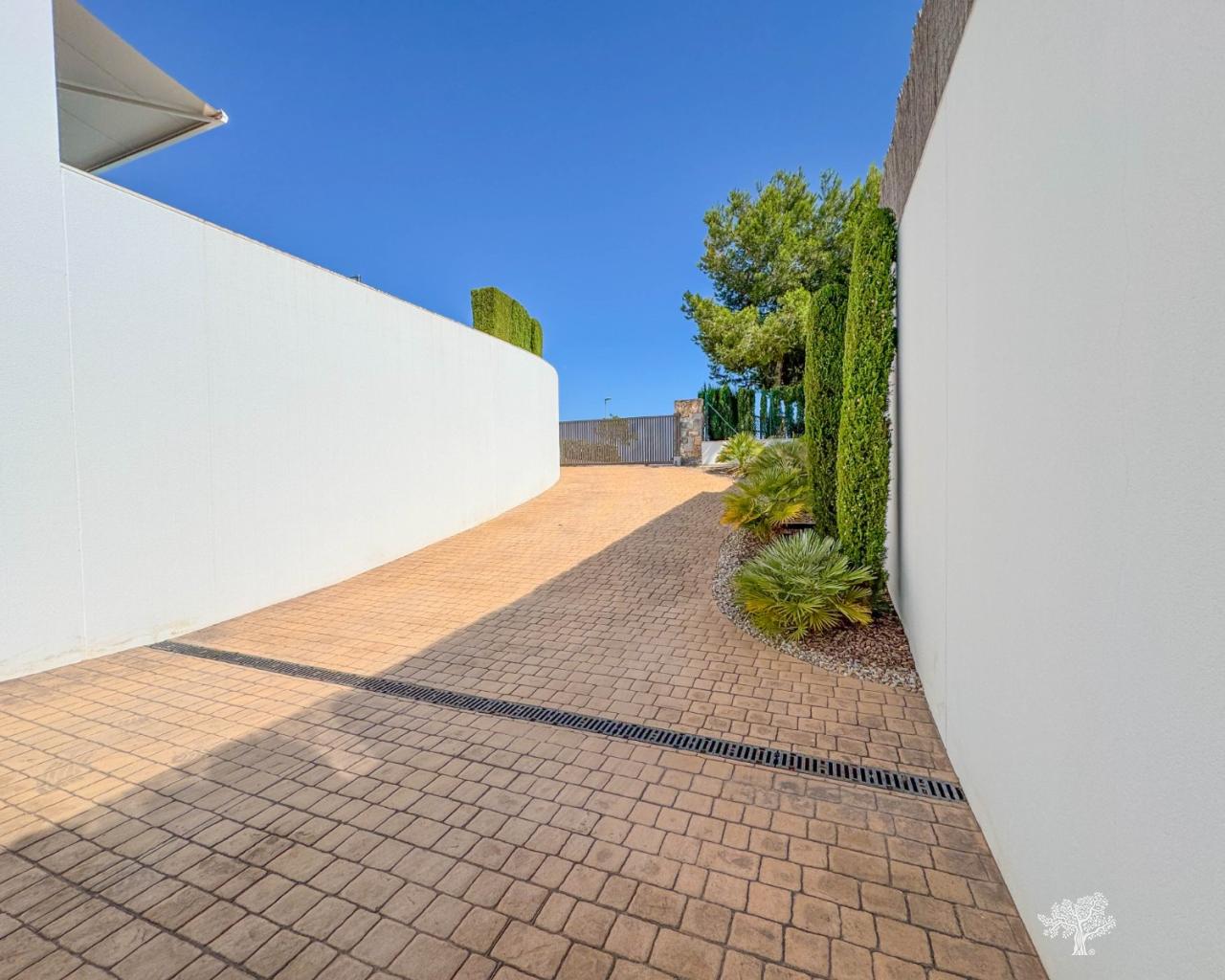 Prachtige vrijstaande villa in moderne stijl, gelegen in de Olivo-gemeenschap, met privézwembad en een ruime tuin. Deze villa bestaat uit 3 slaapkamers, 3 badkamers + gastentoilet, een privézwembad met automatische afdekking en warmtepomp, een garage en ruime terrassen met open uitzicht op zee. Het perceel heeft een oppervlakte van meer dan 1266 m², met een bebouwde oppervlakte van 194 m² en een hoofdterras van 110 m² + een dakterras van 40 m². Zeer privé en rustig gelegen in de Olivo-gemeenschap. De villa is gebouwd op twee niveaus met open uitzicht vanaf het hoofdterras en het solarium. Deze villa wordt gedeeltelijk gemeubileerd verkocht en is inclusief vele extra's, zoals een smart home-systeem, elektrische rolluiken, airconditioning met luchtzone, vloerverwarming op beide verdiepingen en een afdekking en warmtepomp voor het privézwembad. De villa beschikt over een privégarage van 65 m² en een ruime oprit voor meerdere auto's.