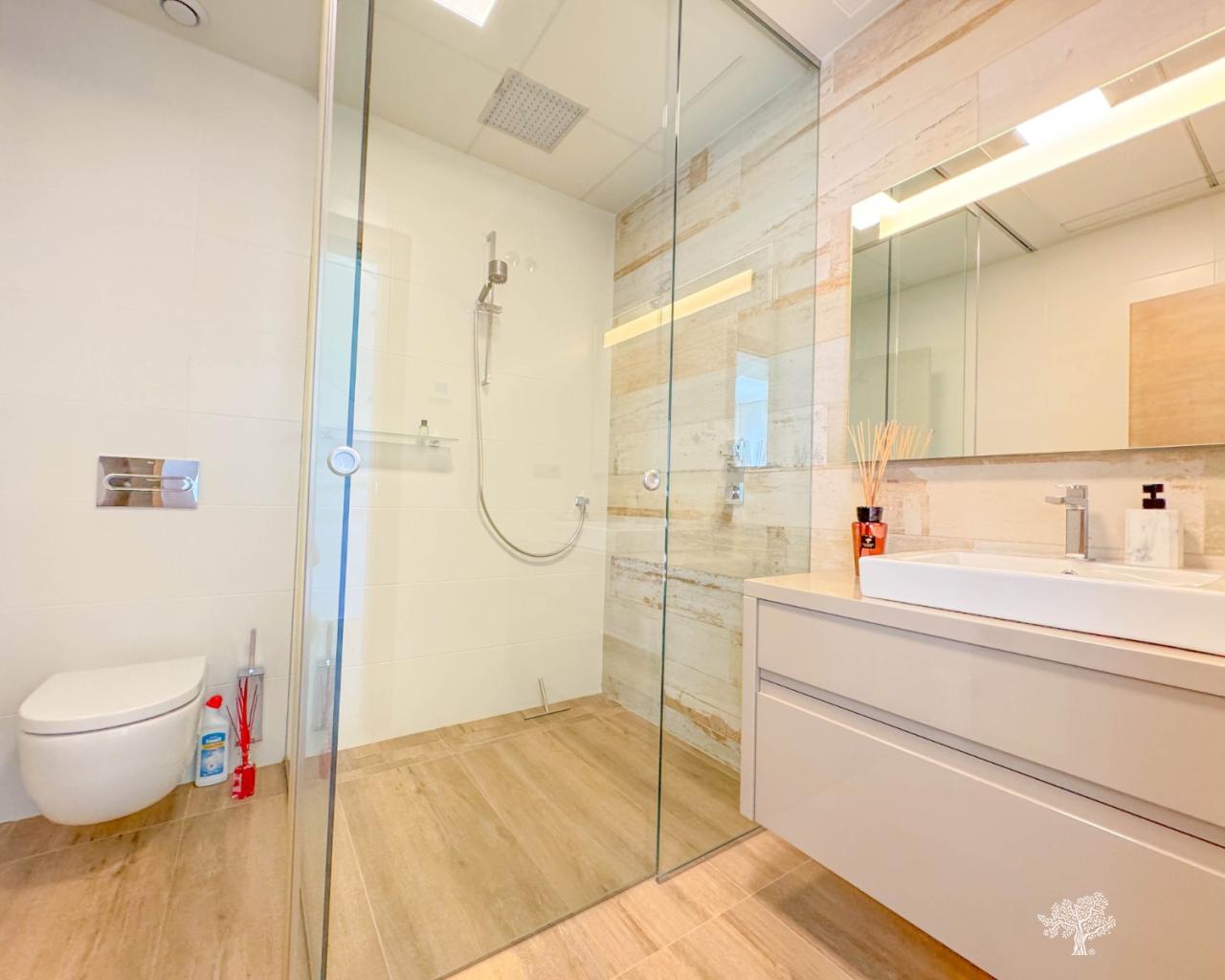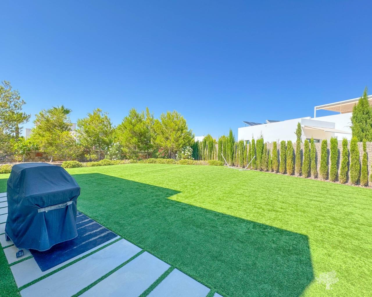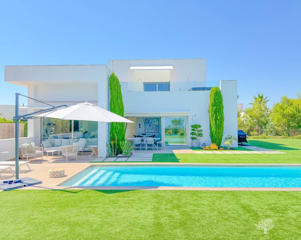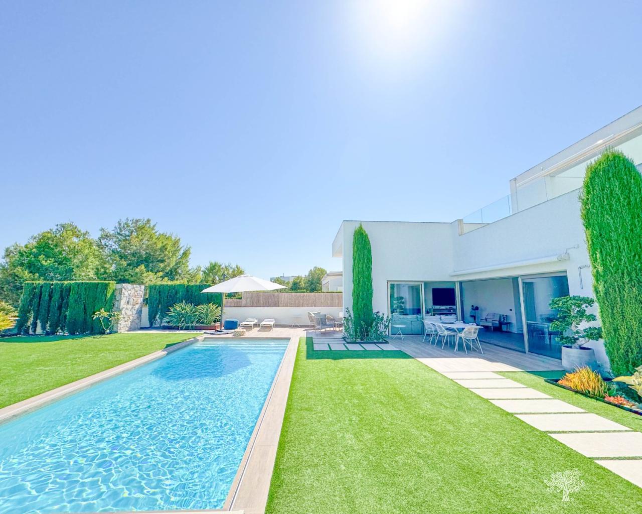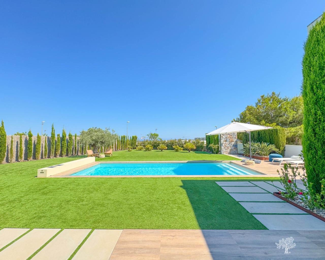 Prachtige vrijstaande villa in moderne stijl, gelegen in de Olivo-gemeenschap, met privézwembad en een ruime tuin. Deze villa bestaat uit 3 slaapkamers, 3 badkamers + gastentoilet, een privézwembad met automatische afdekking en warmtepomp, een garage en ruime terrassen met open uitzicht op zee. Het perceel heeft een oppervlakte van meer dan 1266 m², met een bebouwde oppervlakte van 194 m² en een hoofdterras van 110 m² + een dakterras van 40 m². Zeer privé en rustig gelegen in de Olivo-gemeenschap. De villa is gebouwd op twee niveaus met open uitzicht vanaf het hoofdterras en het solarium. Deze villa wordt gedeeltelijk gemeubileerd verkocht en is inclusief vele extra's, zoals een smart home-systeem, elektrische rolluiken, airconditioning met luchtzone, vloerverwarming op beide verdiepingen en een afdekking en warmtepomp voor het privézwembad. De villa beschikt over een privégarage van 65 m² en een ruime oprit voor meerdere auto's.