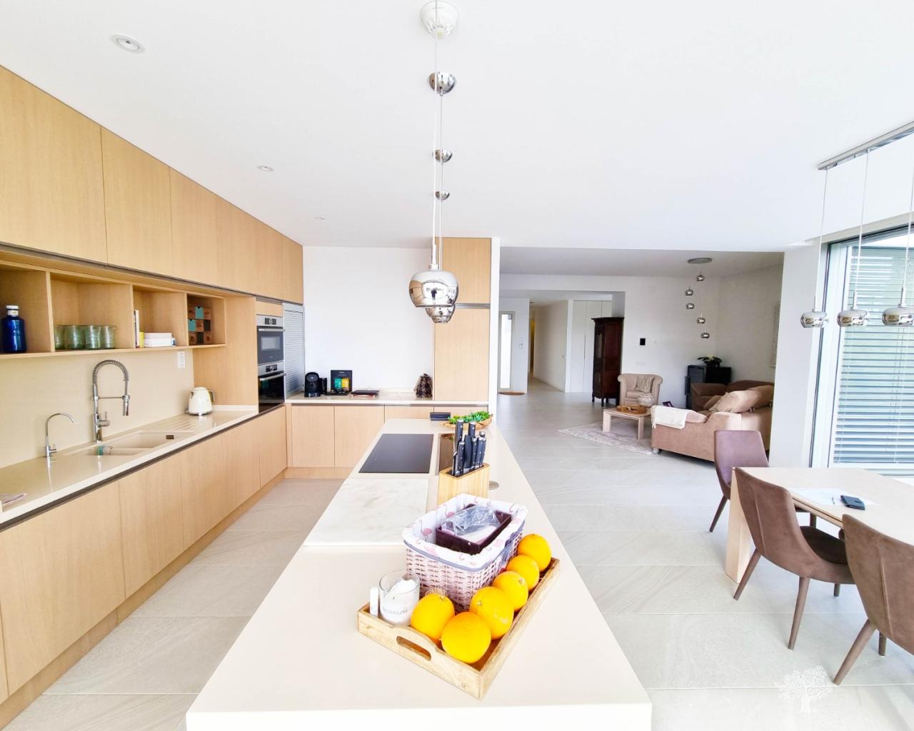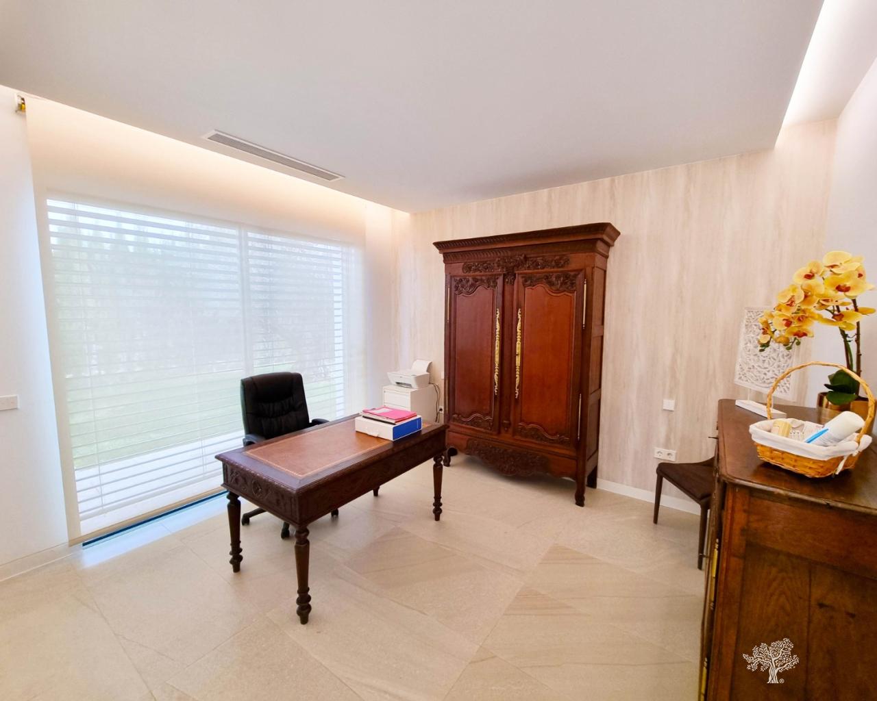 De buitenruimtes zijn al even indrukwekkend, met een privézwembad in een prachtig aangelegde tuin, een serene oase van privacy en rust. Elk detail is zorgvuldig overwogen om het gevoel van luxe te versterken, van de naadloze overgang tussen binnen en buiten tot de hoogwaardige afwerkingen in de hele woning.