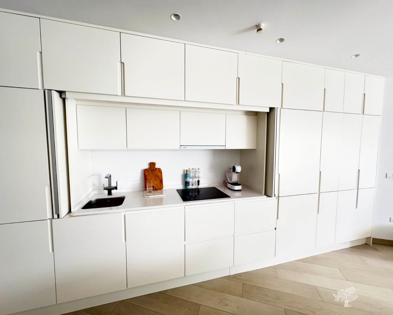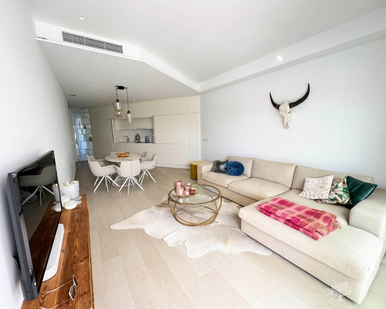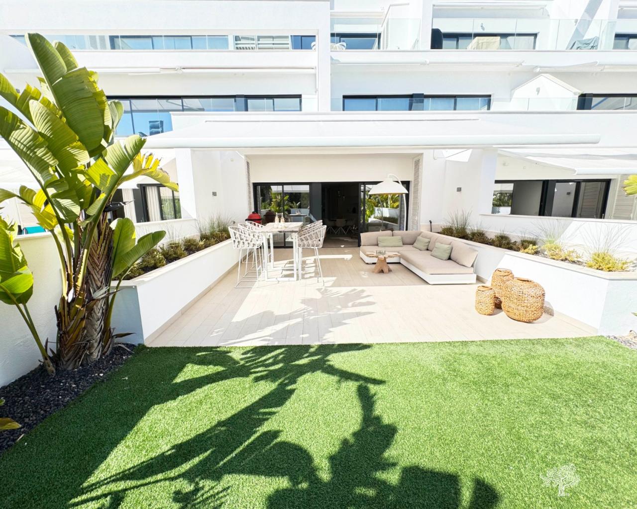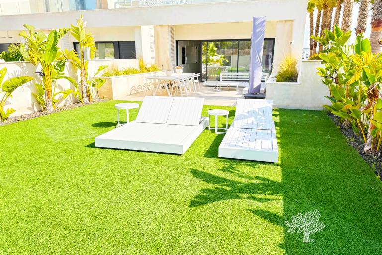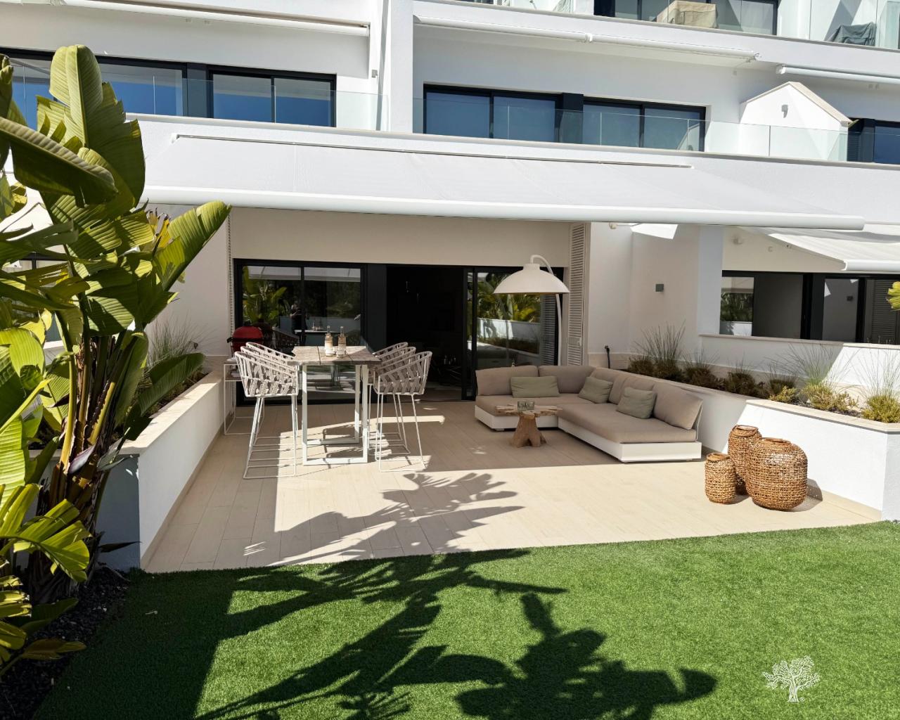 The interior has been designed with a luxurious finish with top quality equipment. The layout comprises of an entrance hallway leading to the bright and spacious open plan lounge and dining area with large windows overlooking and opening on to the terrace and garden. Within the main living space is a fully equipped American style kitchen finished in white with a sleek design feature where the food preparation area can be fully enclosed when not in use. The large Primary bedroom includes an en-suite bathroom with feature rain shower, built in wardrobes, and also has patio door access on to the main terrace. There are a further two good sized double bedrooms overlooking the green landscape at the rear of the property, both bedrooms including built in wardrobes, and there is a separate guest bathroom with a rain shower. The property has been tastefully designed and decorated with neutral tones including light wood coloured tiles throughout the entire apartment that extend to the terrace which brings the interior and exterior spaces into one. The property is being sold fully furnished, and includes full installation of air conditioning, underfloor heating in both bathrooms, Home automation system with Domotica, electric interior blinds, and private underground parking with storage room.